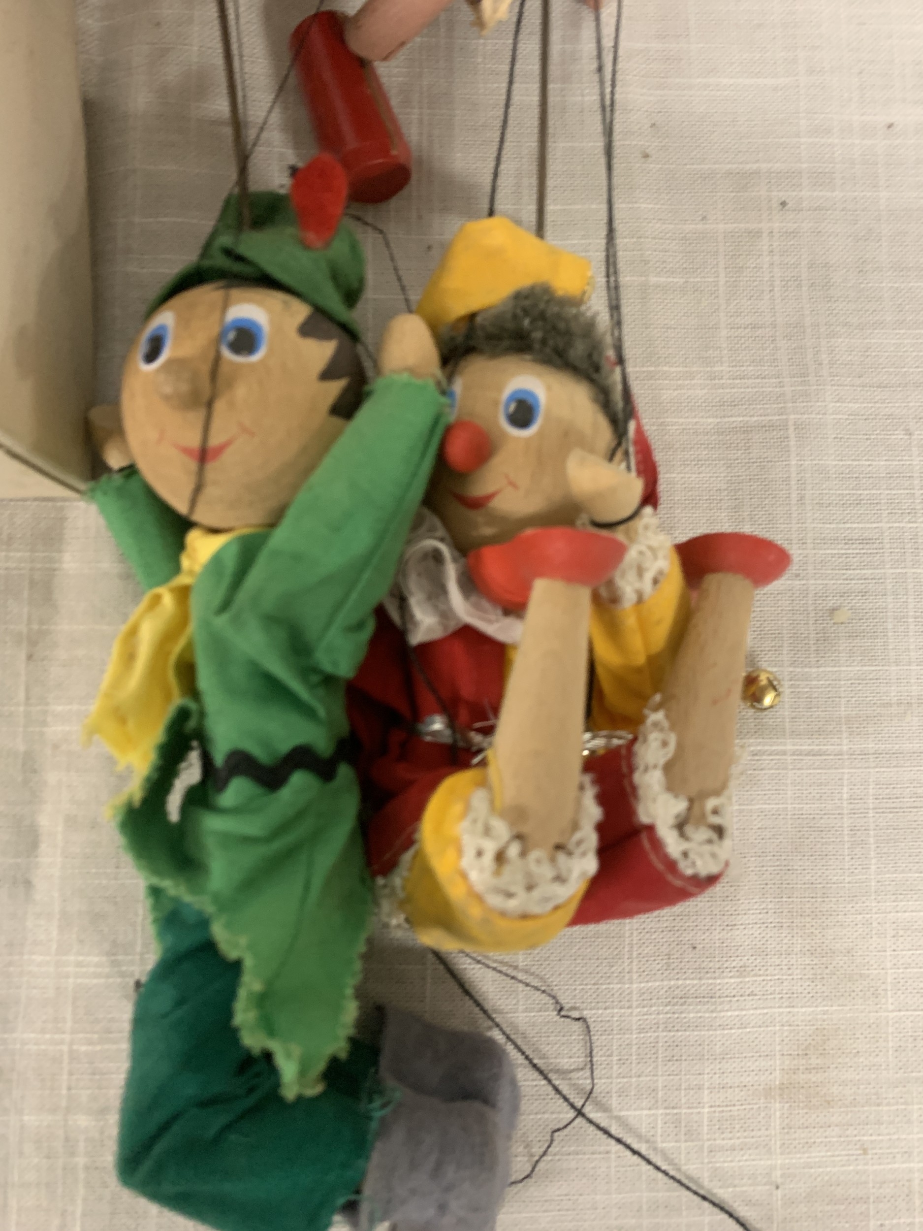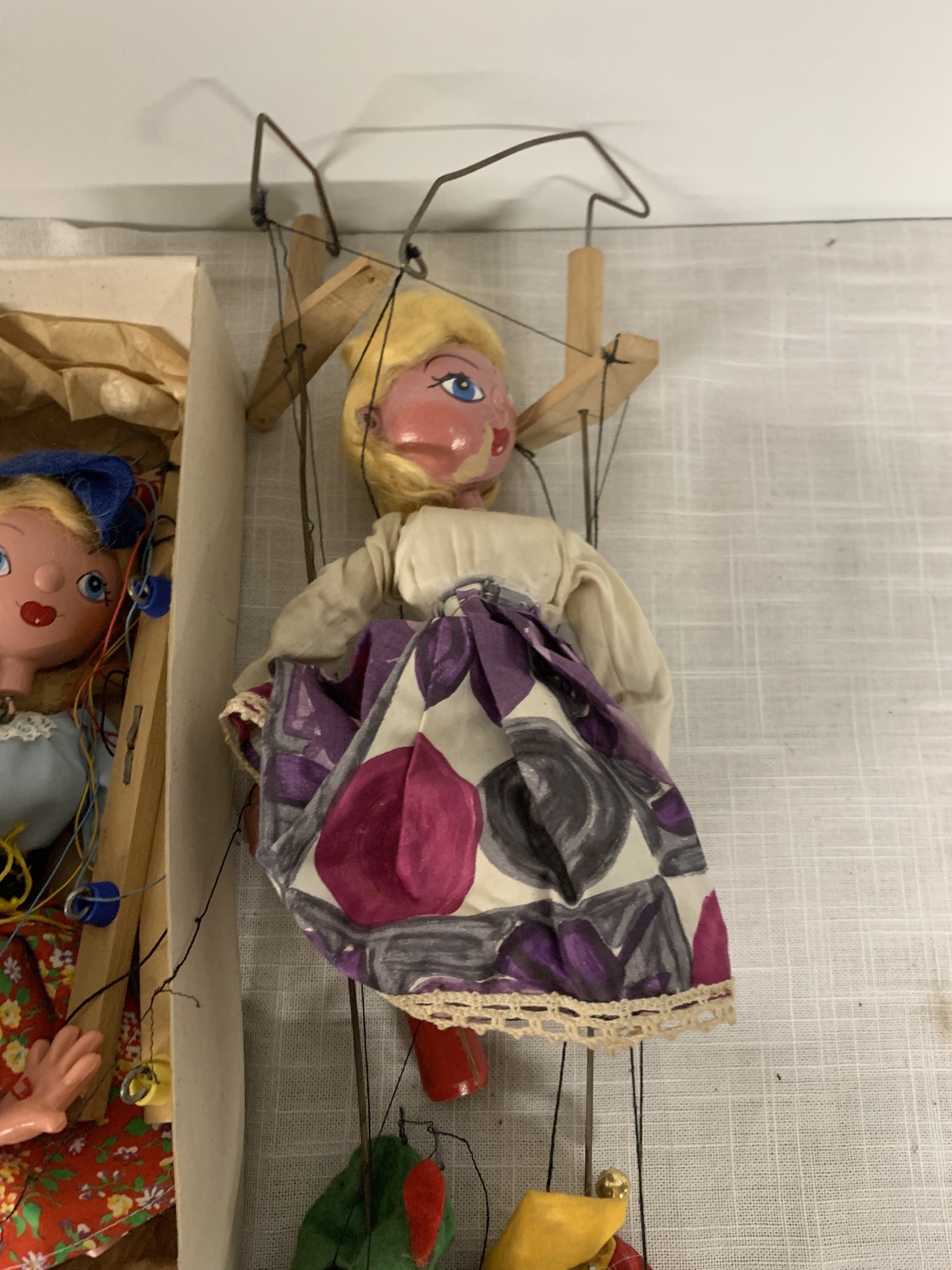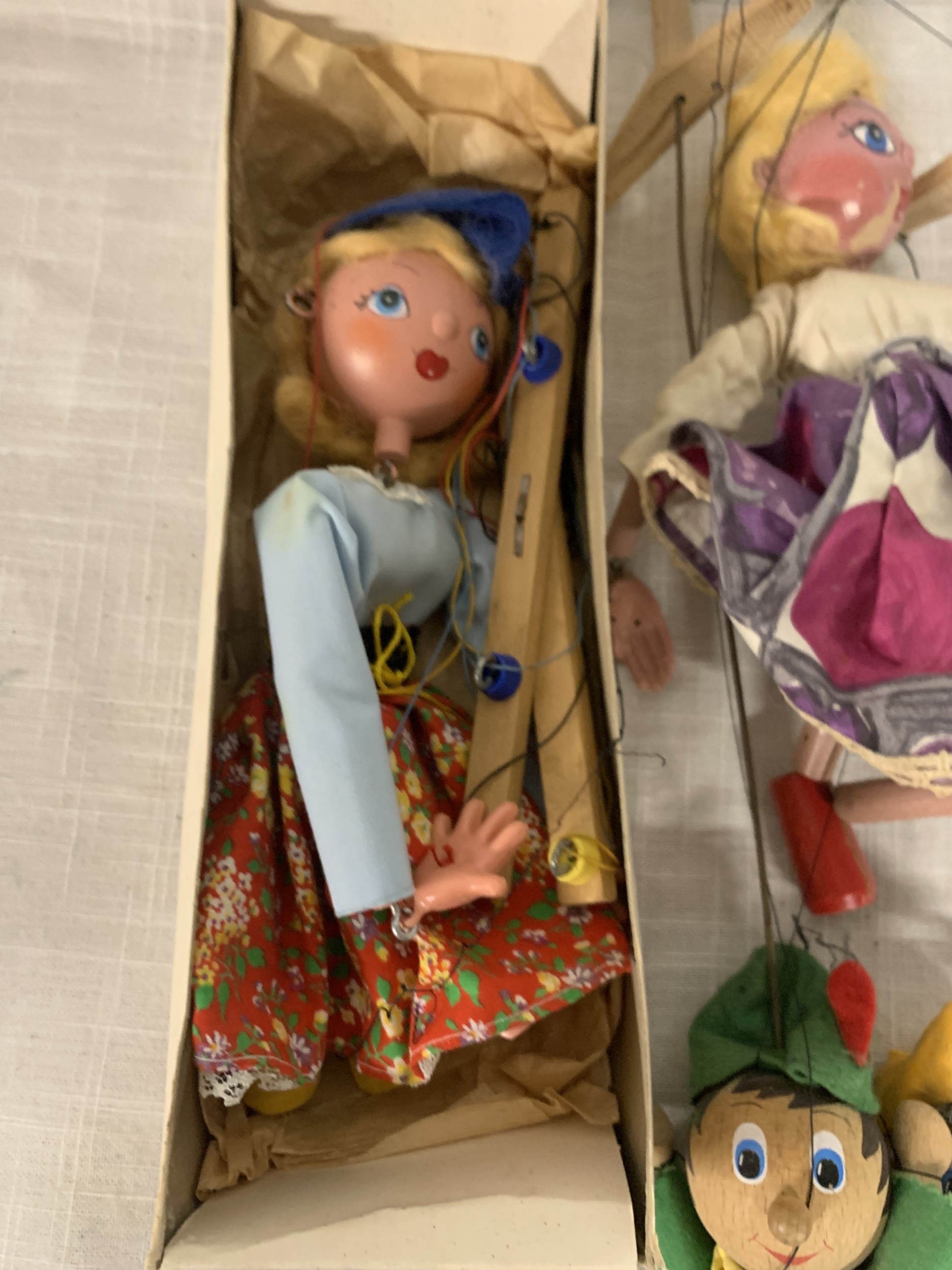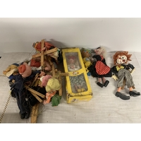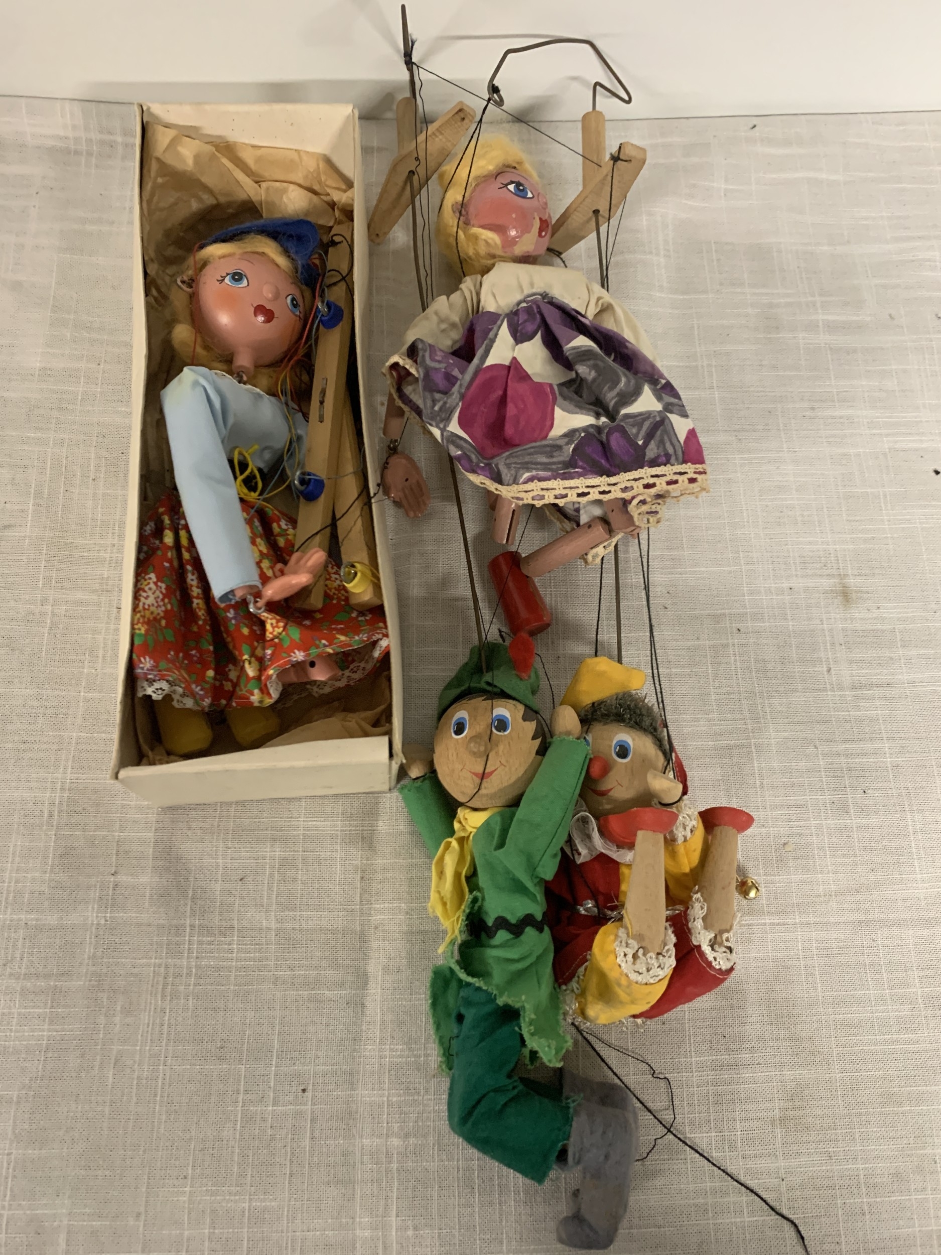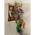 FOUR VINTAGE PELHAM PUPPETS ONE BOXED TO INCLUDE DUTCH GIRL, ROBIN HOOD ETC