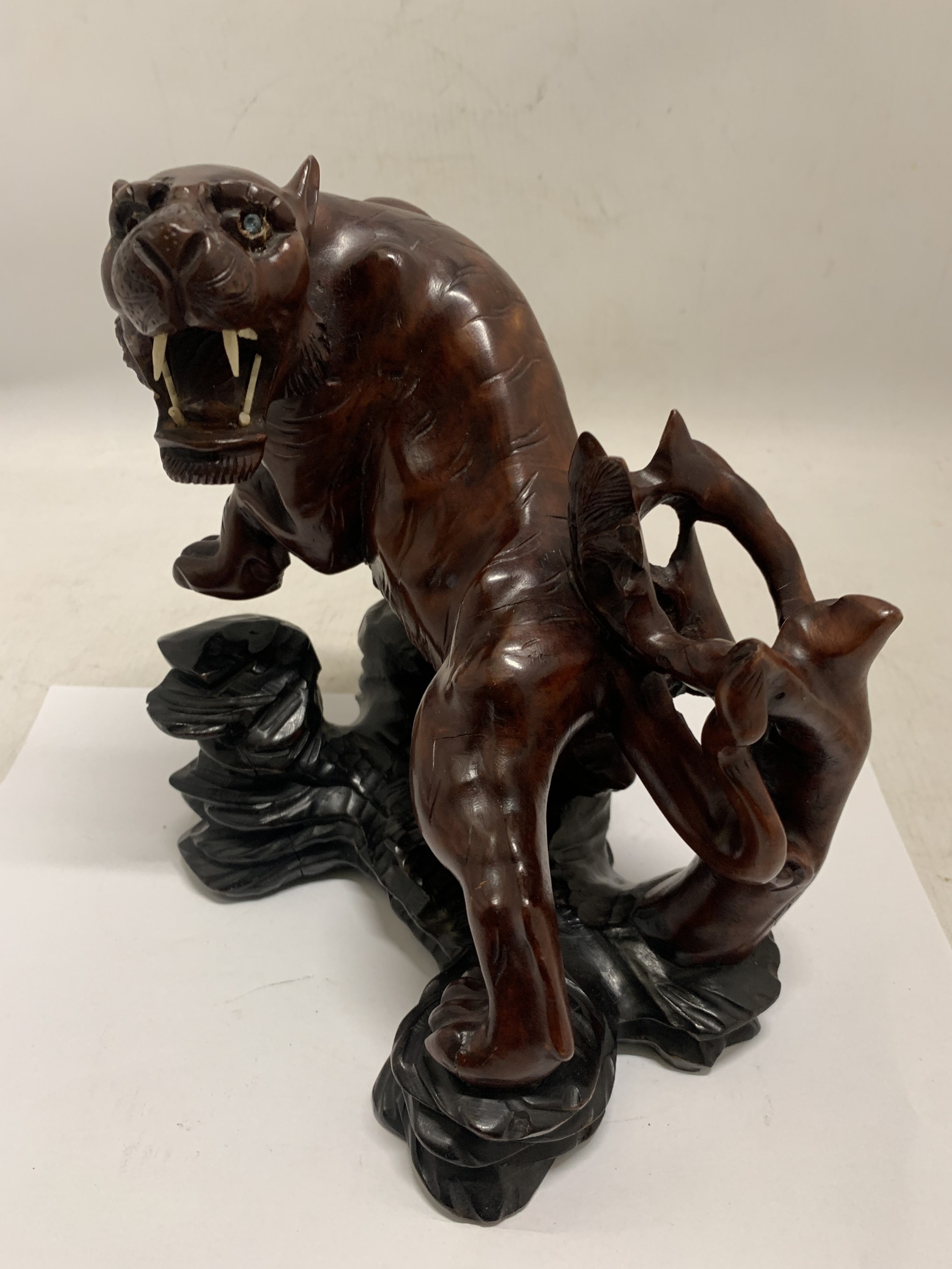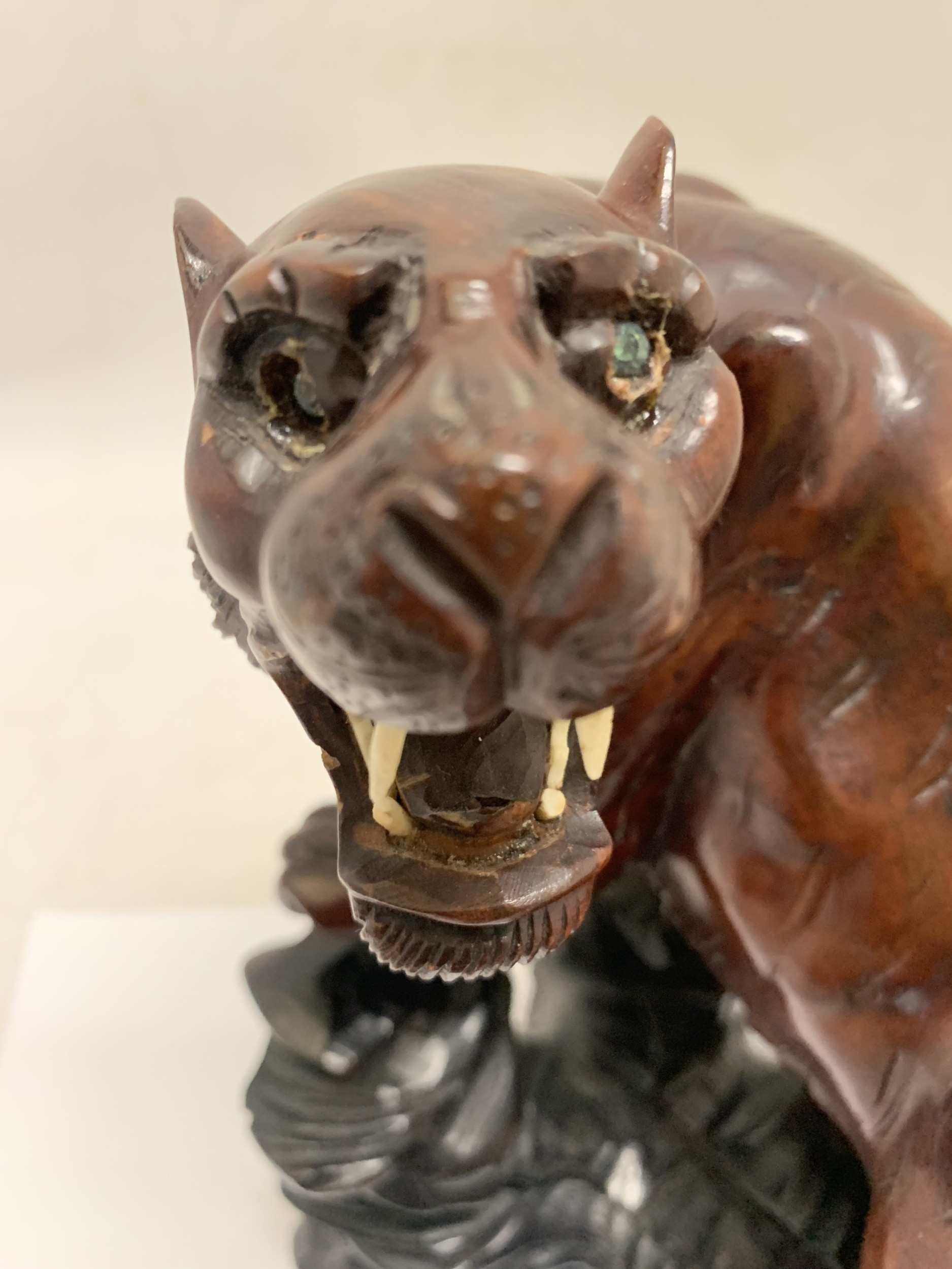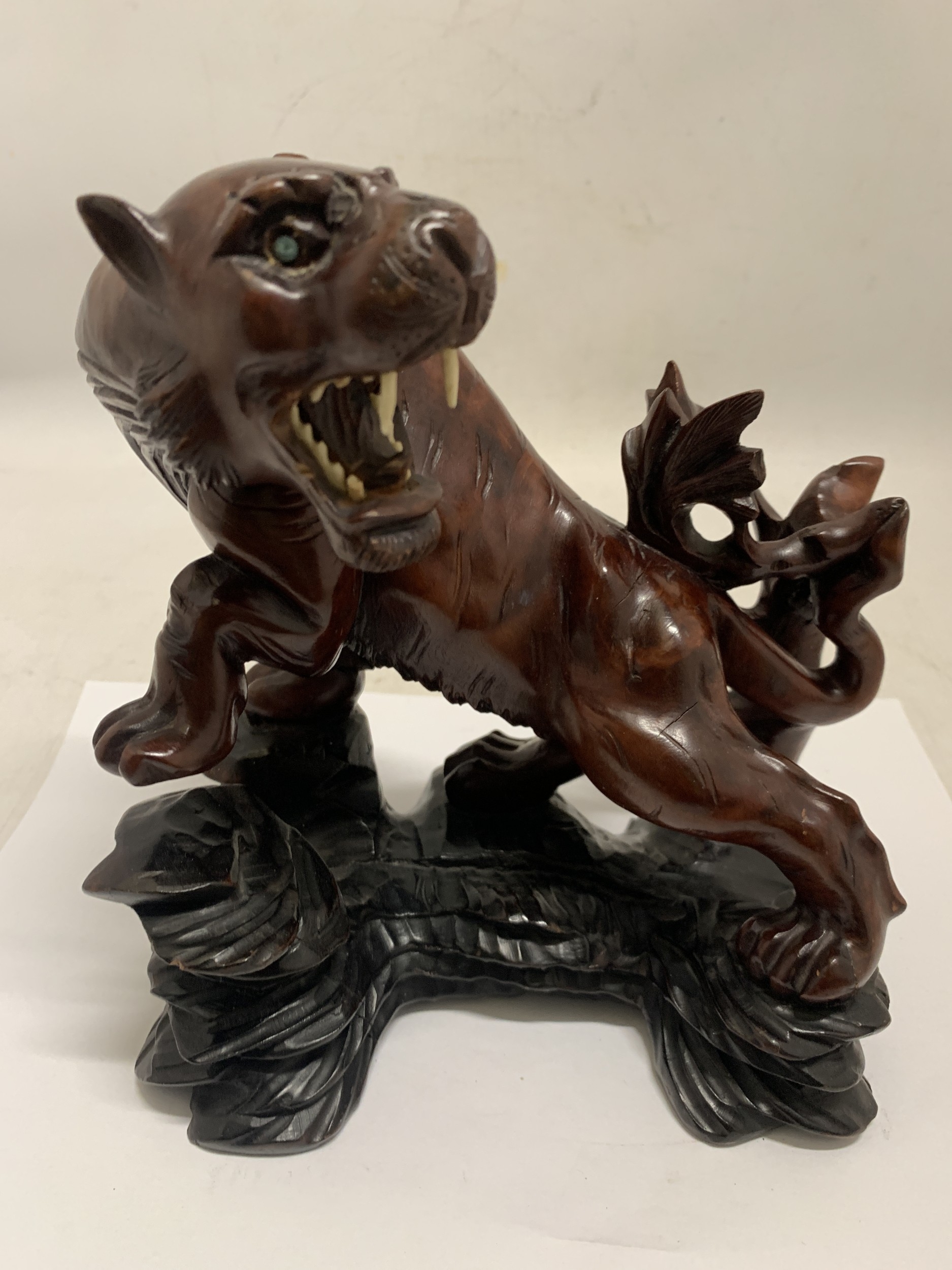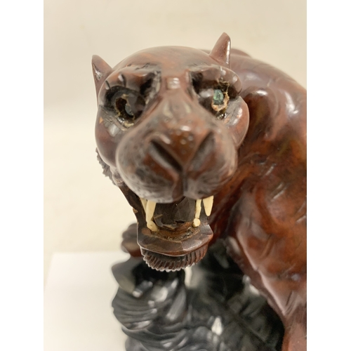 A CHINESE HAND-CARVED WOODEN TIGER STATUE WITH GLASS EYES - 19 CM (H) 18 CM (L)