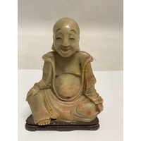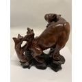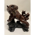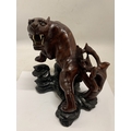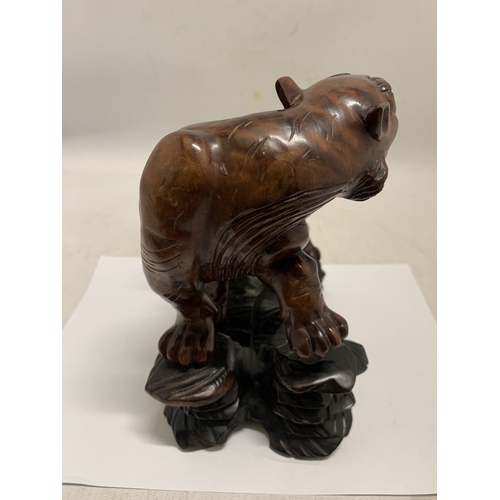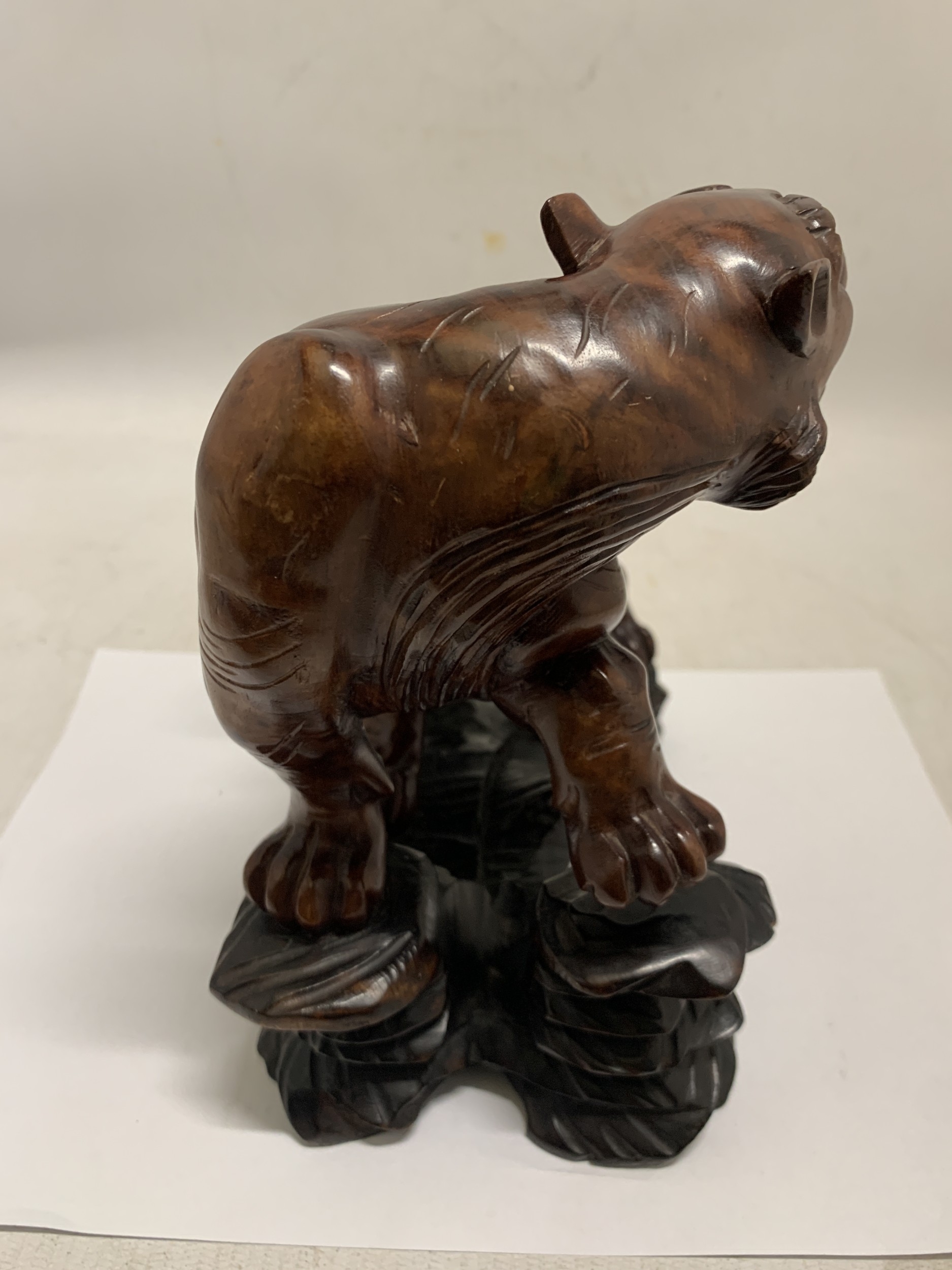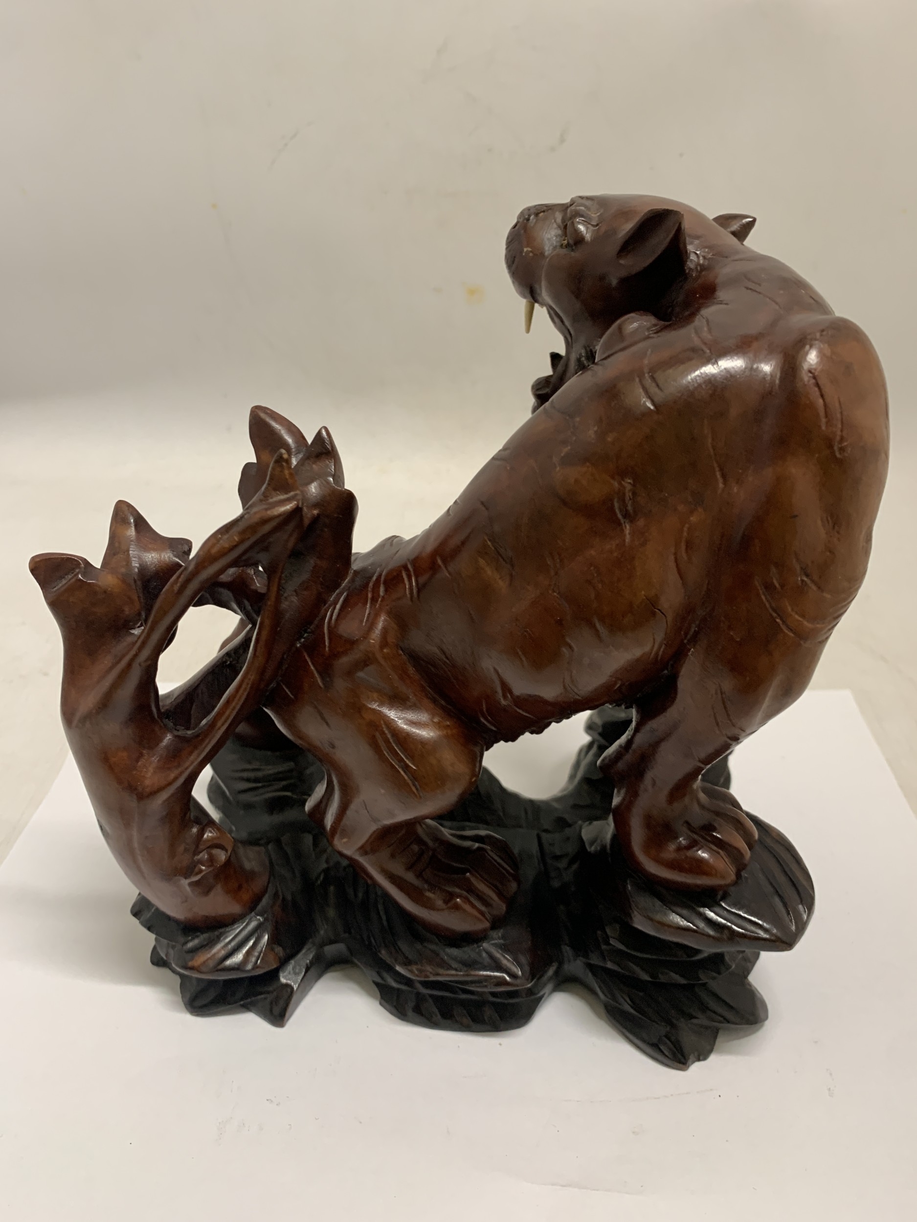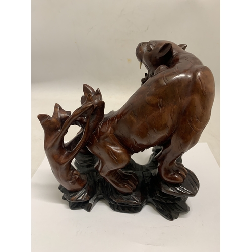 A CHINESE HAND-CARVED WOODEN TIGER STATUE WITH GLASS EYES - 19 CM (H) 18 CM (L)