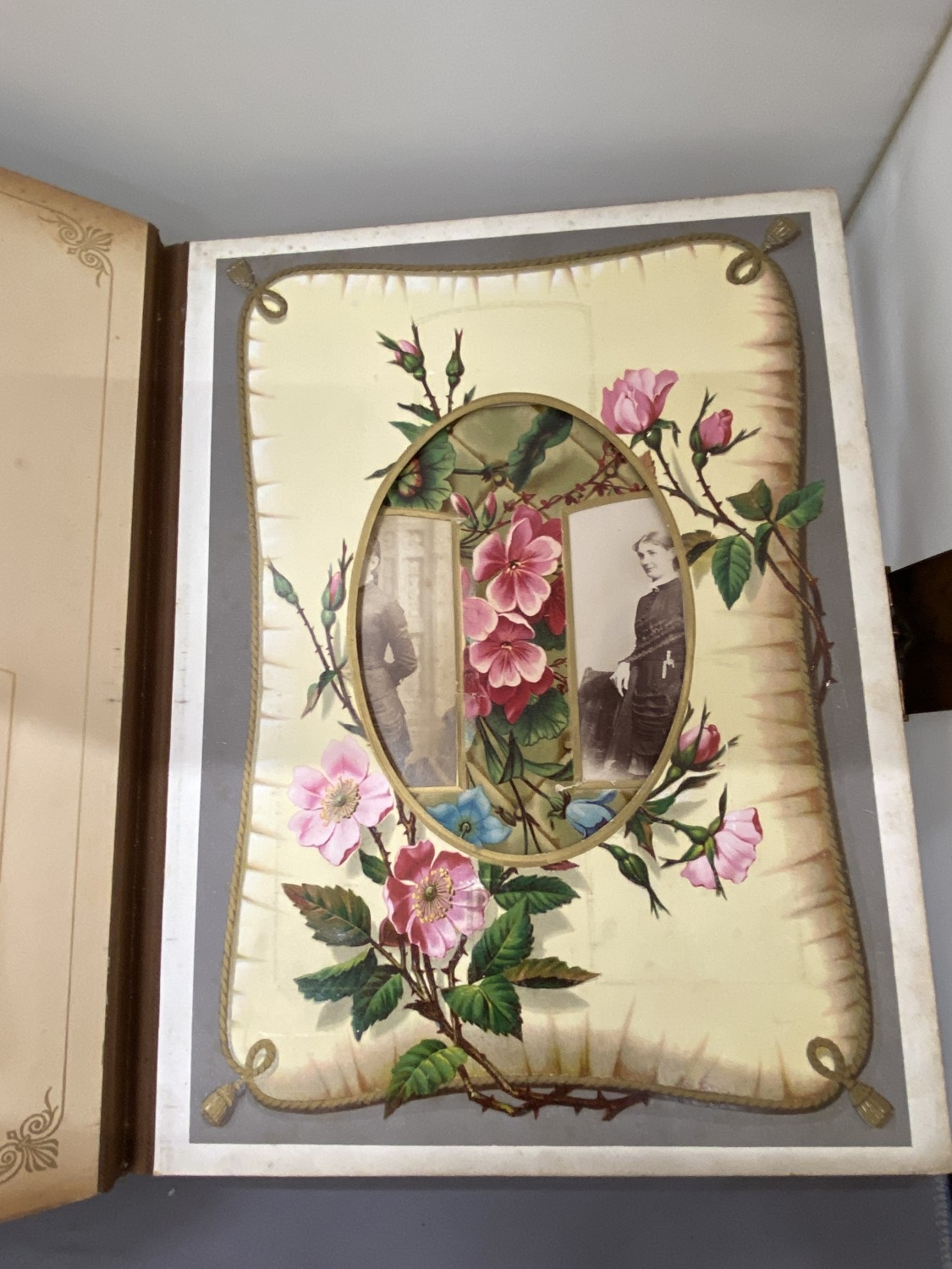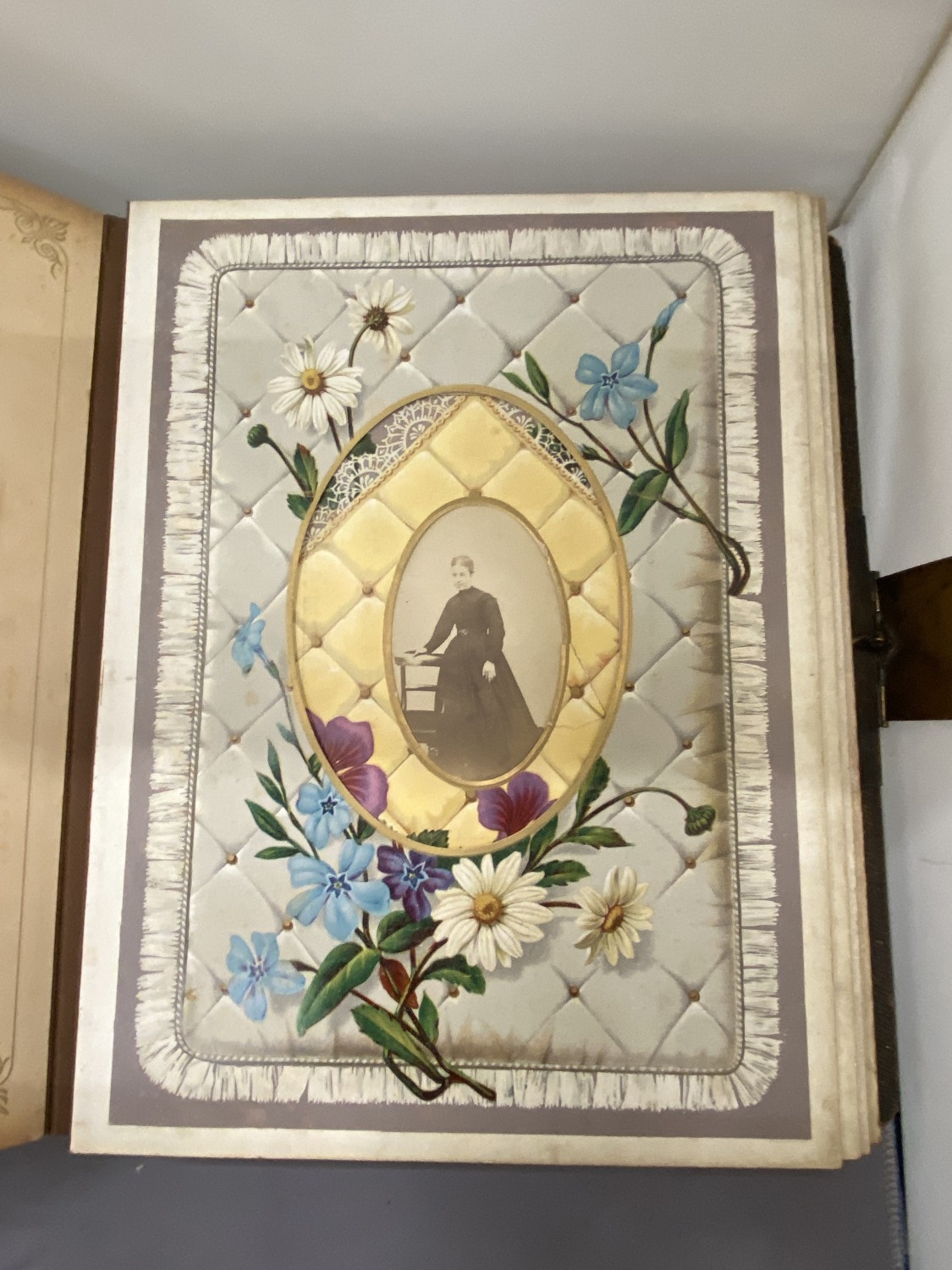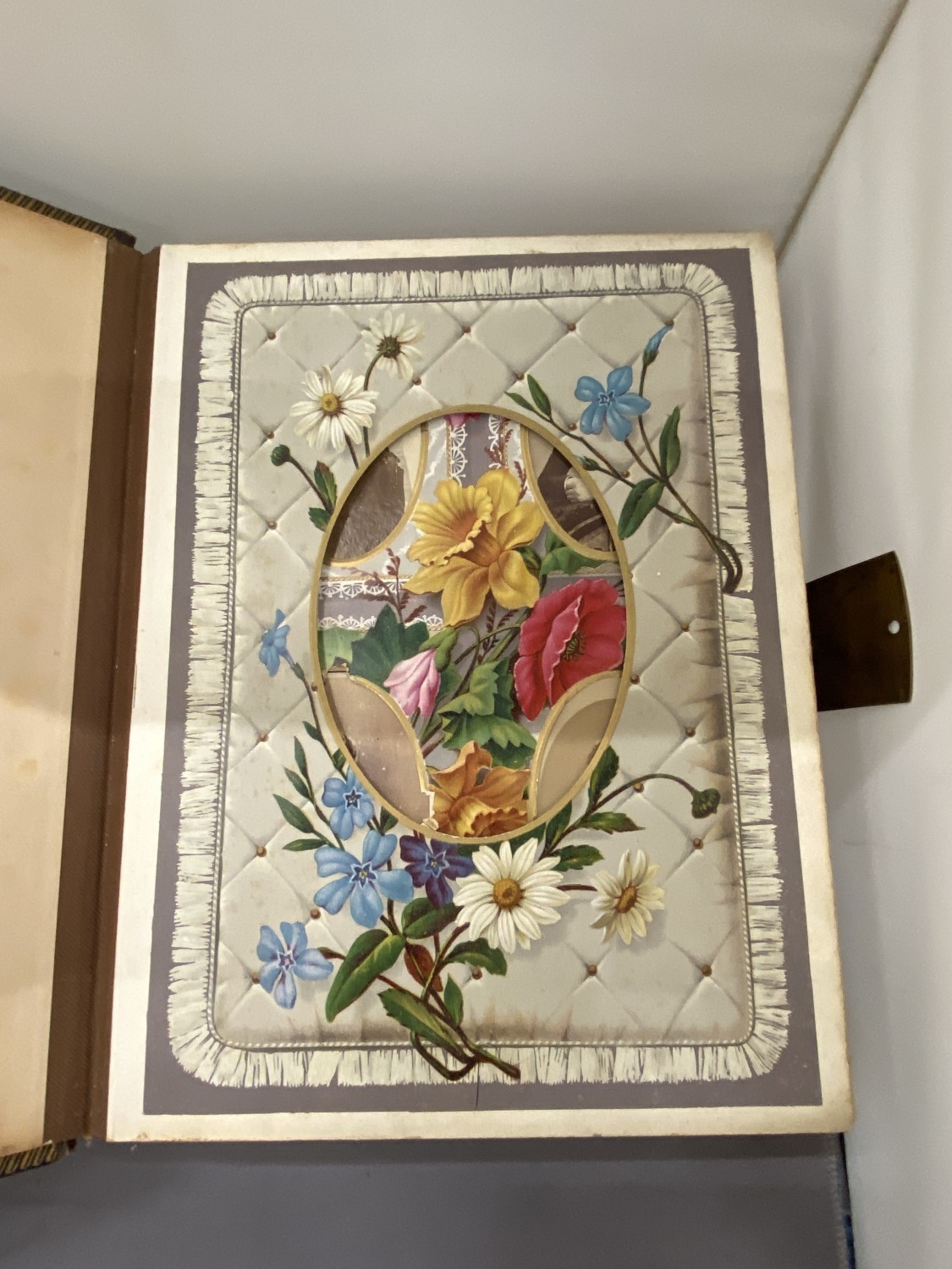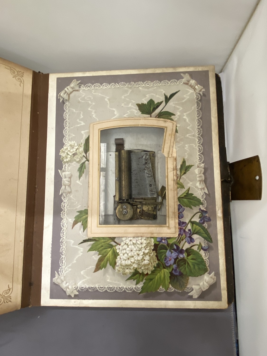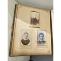 A VICTORIAN LEATHER MUSICAL PHOTO ALBUM CONTAINING PHOTOS, WITH KEY (KEY IN OFFICE)