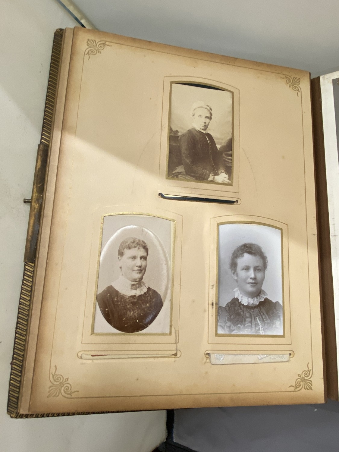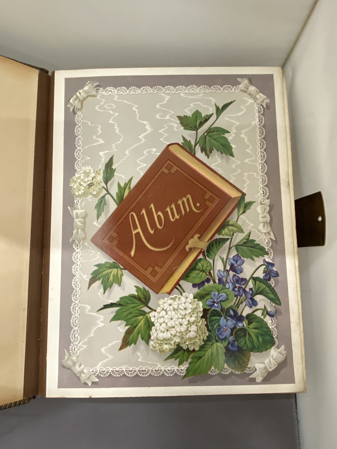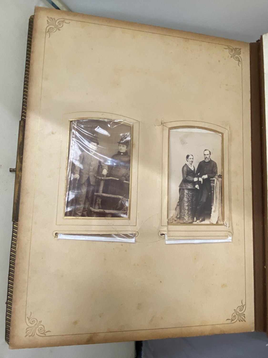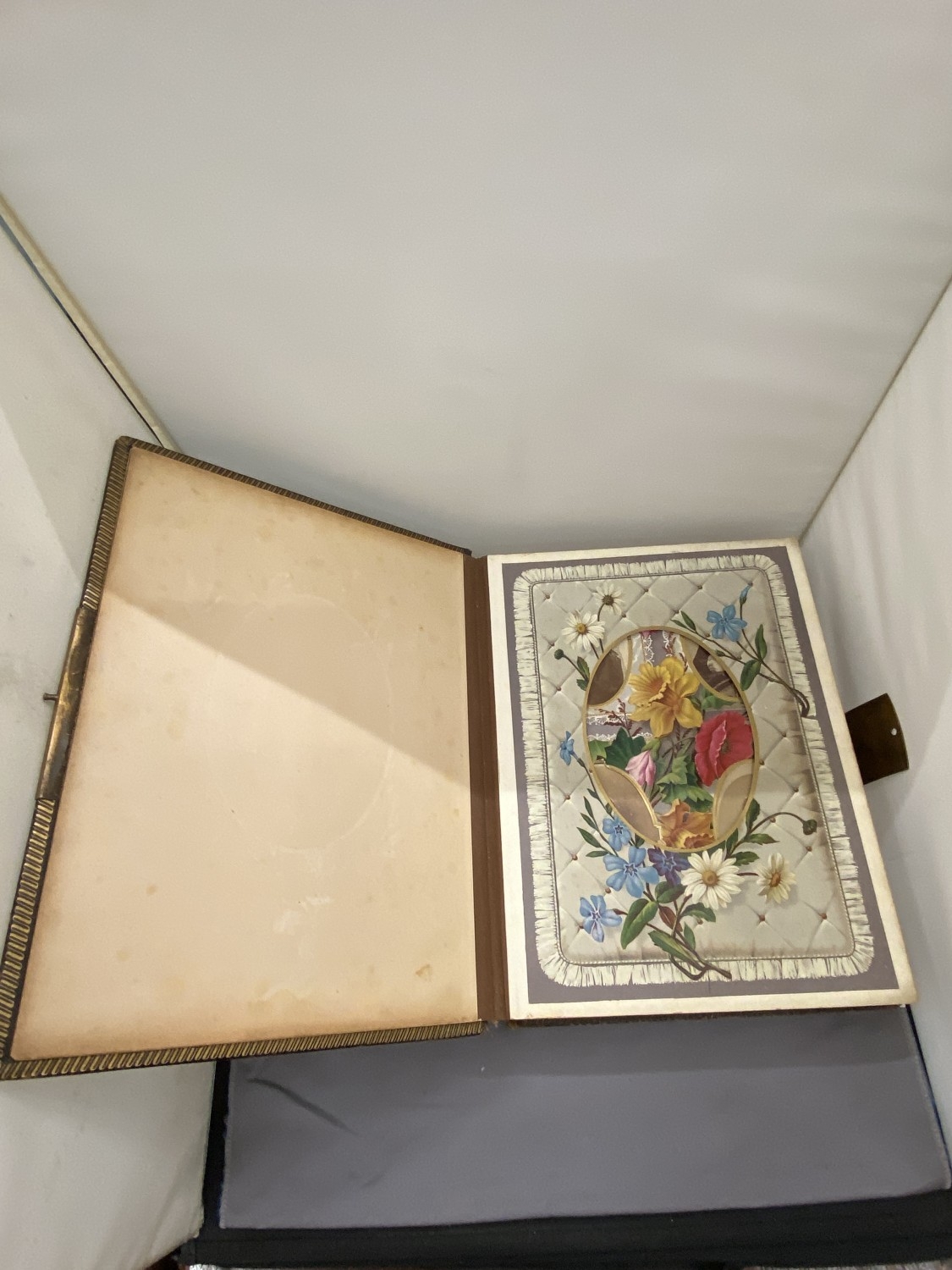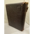A VICTORIAN LEATHER MUSICAL PHOTO ALBUM CONTAINING PHOTOS, WITH KEY (KEY IN OFFICE)