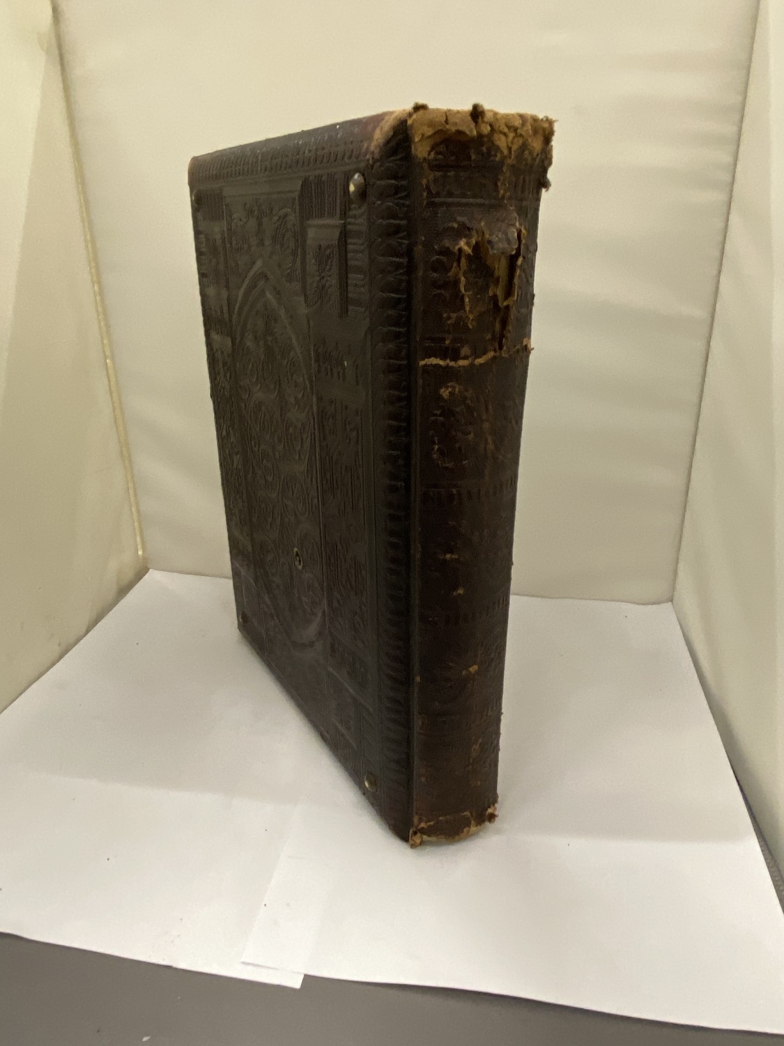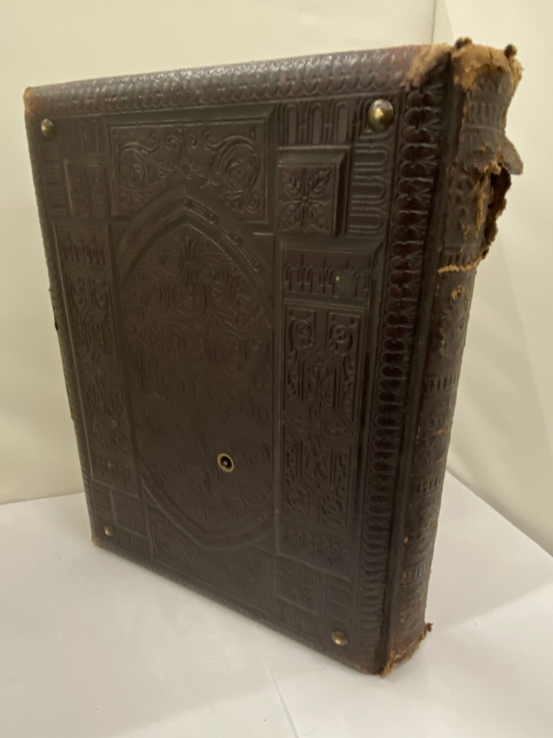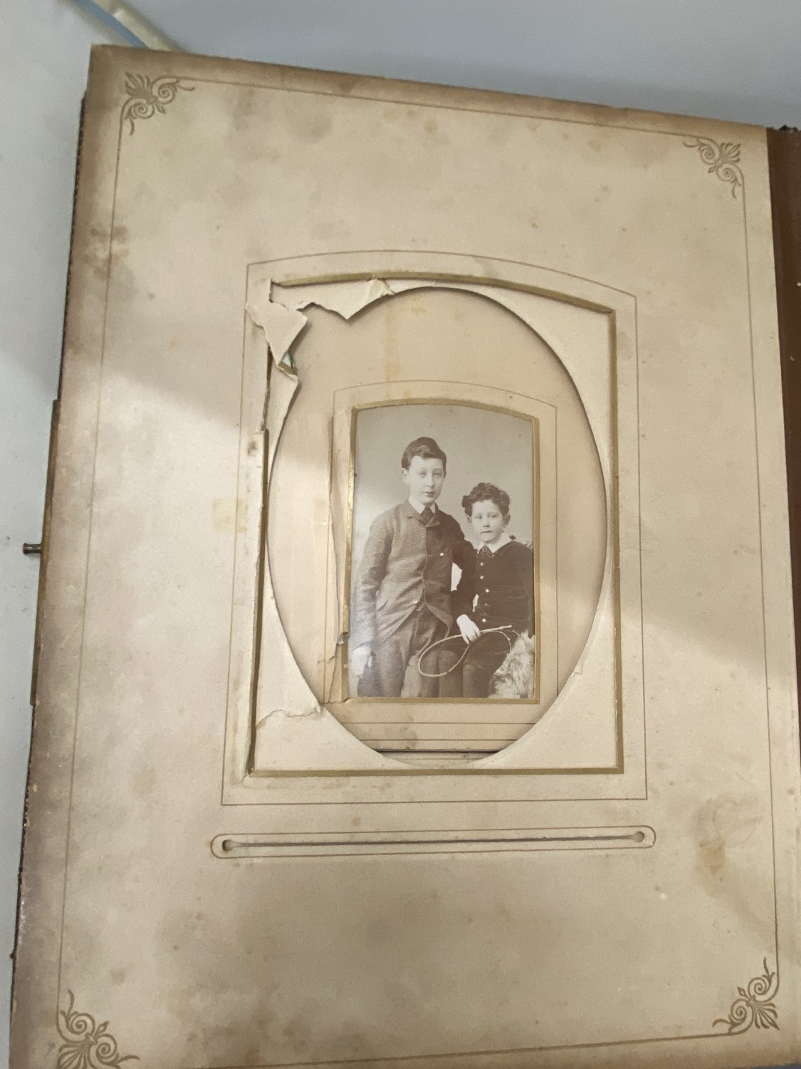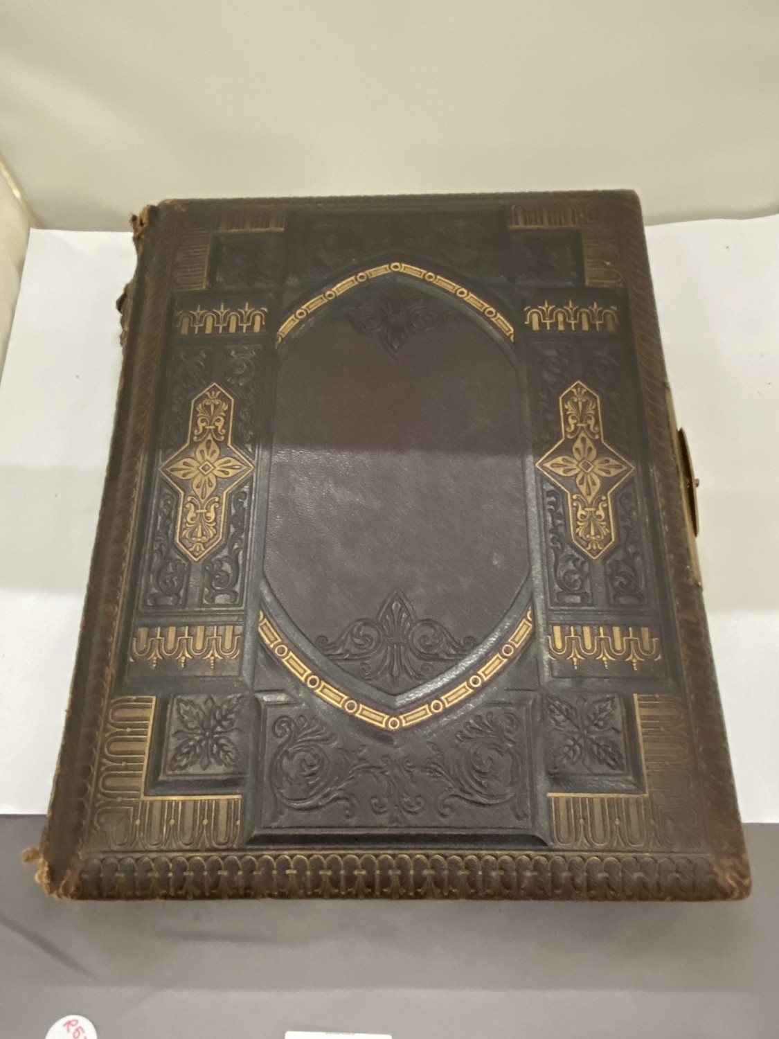 A VICTORIAN LEATHER MUSICAL PHOTO ALBUM CONTAINING PHOTOS, WITH KEY (KEY IN OFFICE)