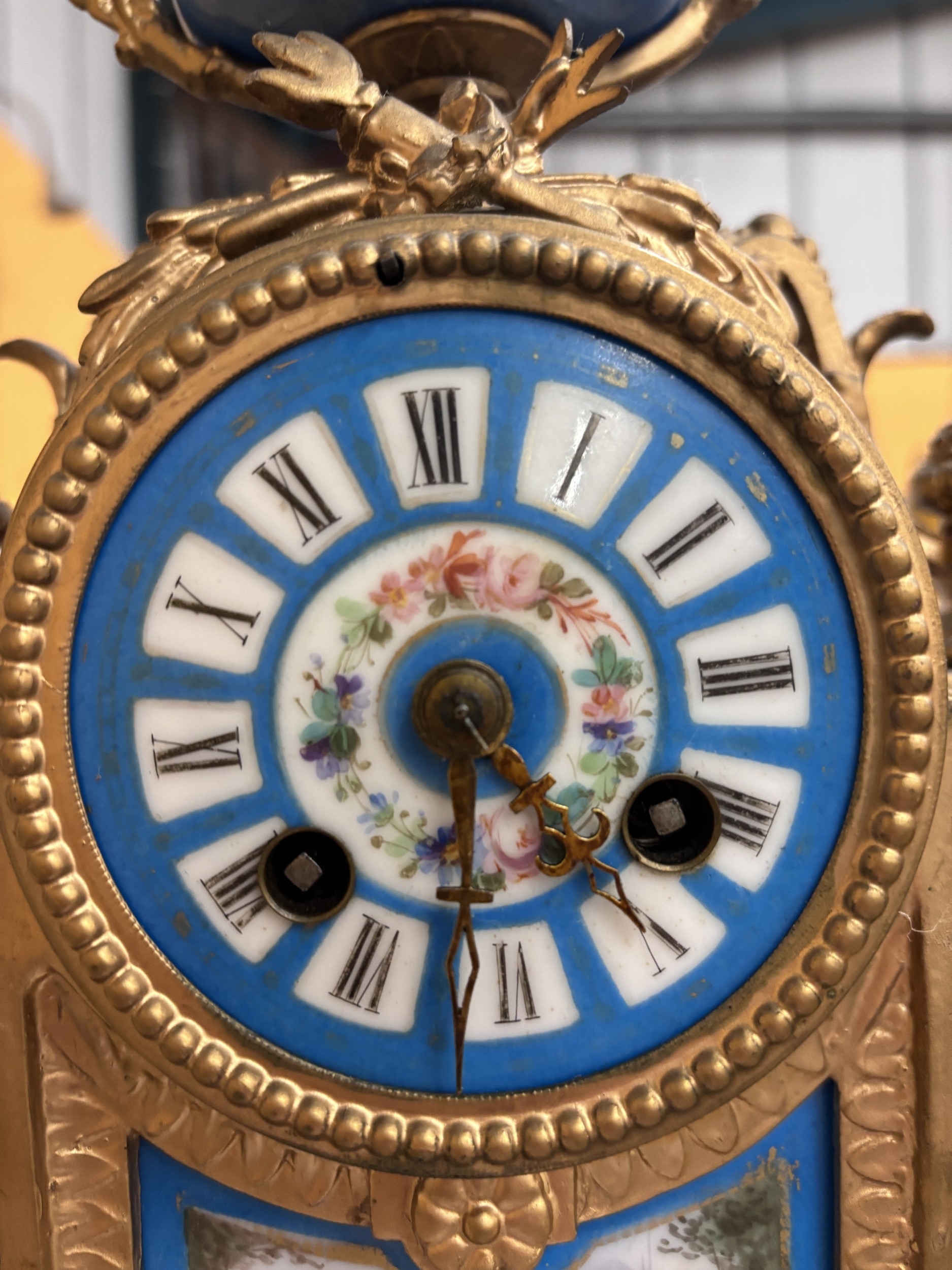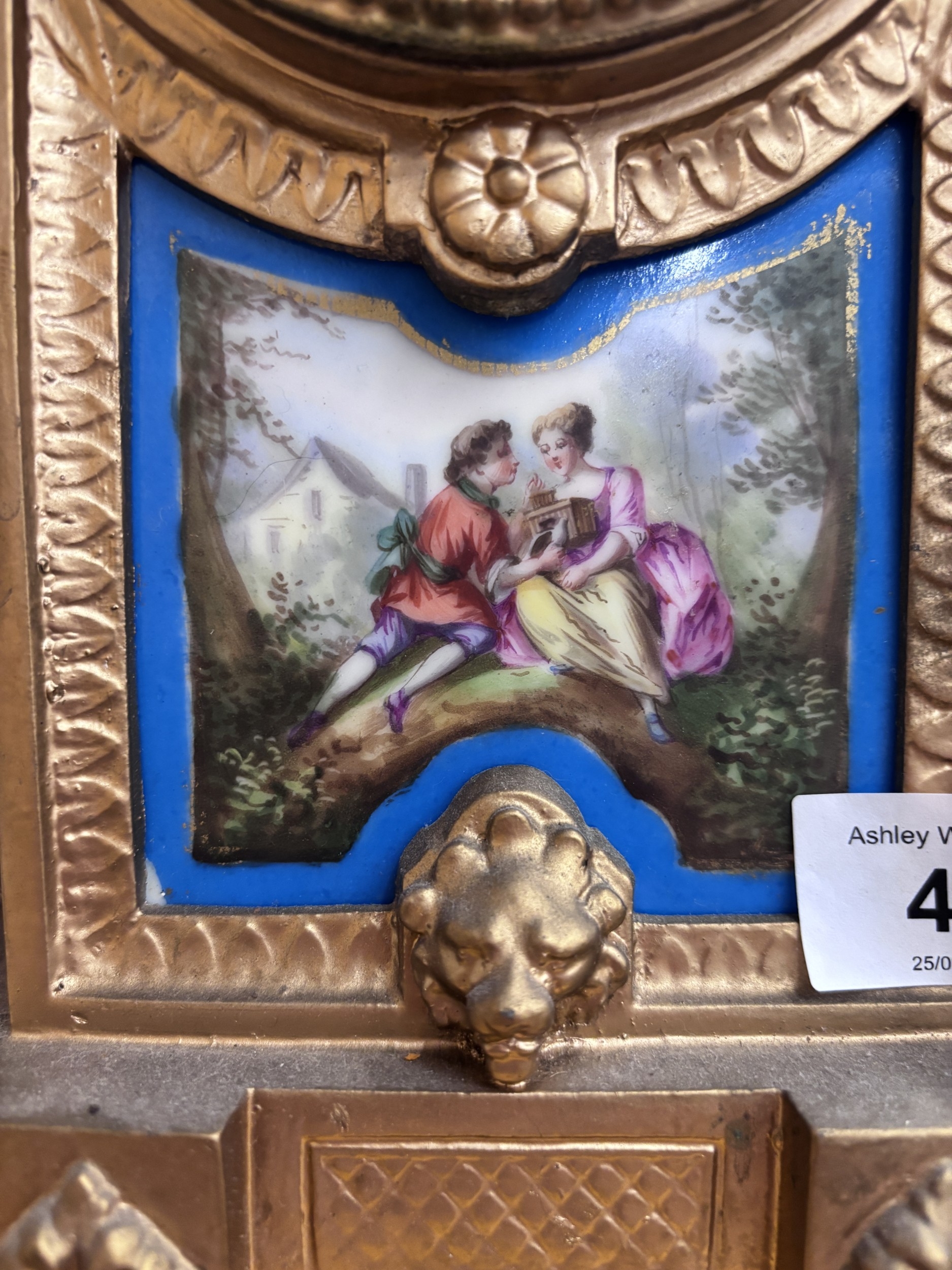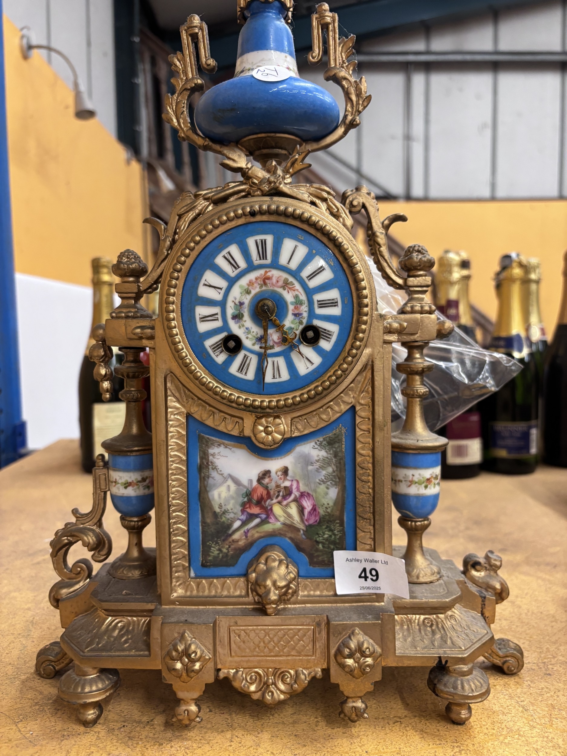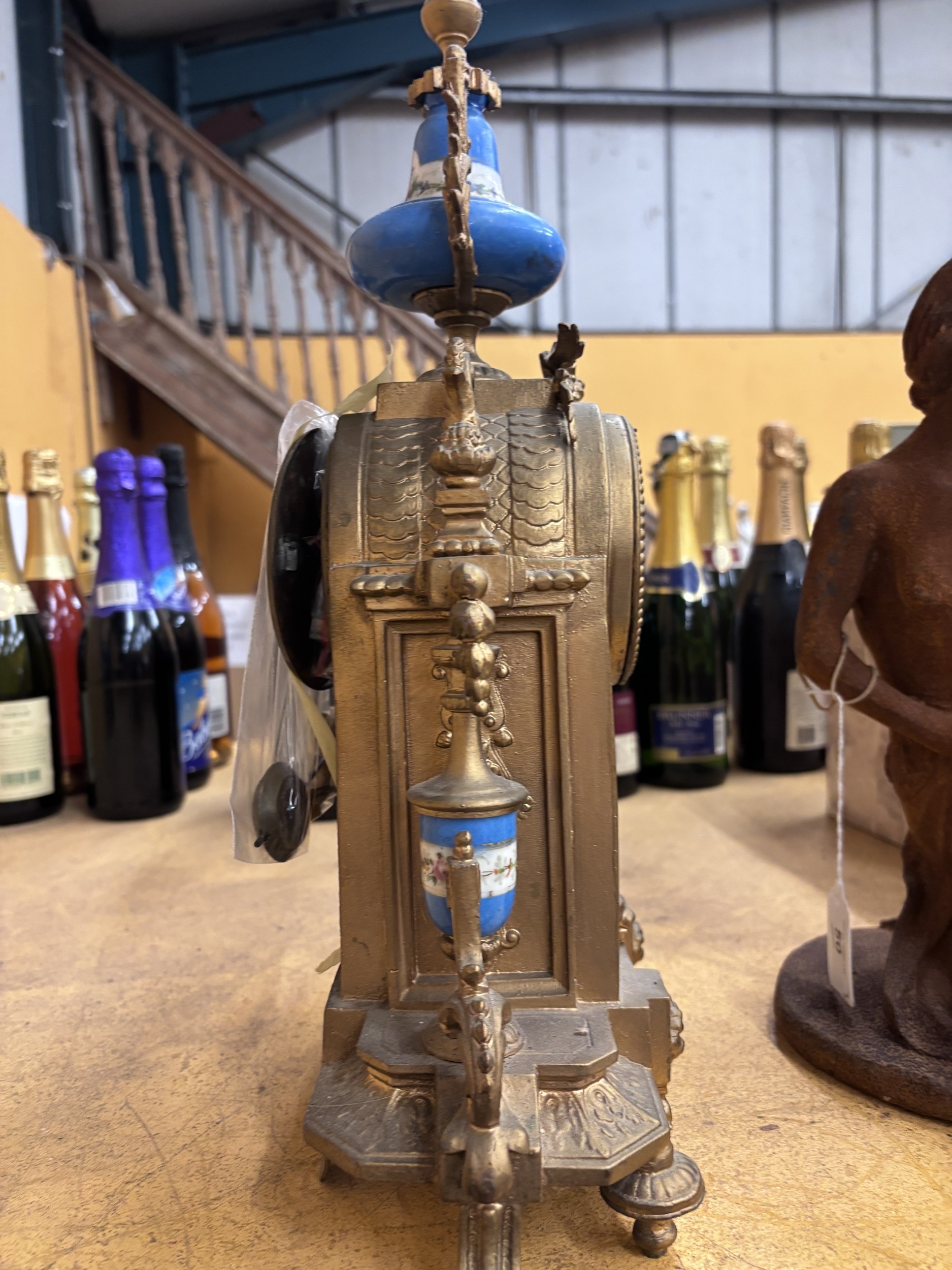 AN ANTIQUE FRENCH CLOCK WITH PORCELAIN BODIED PANELS, WITH KEY AND PENDULUM, HEIGHT APPROX 42CM