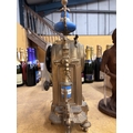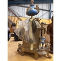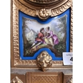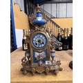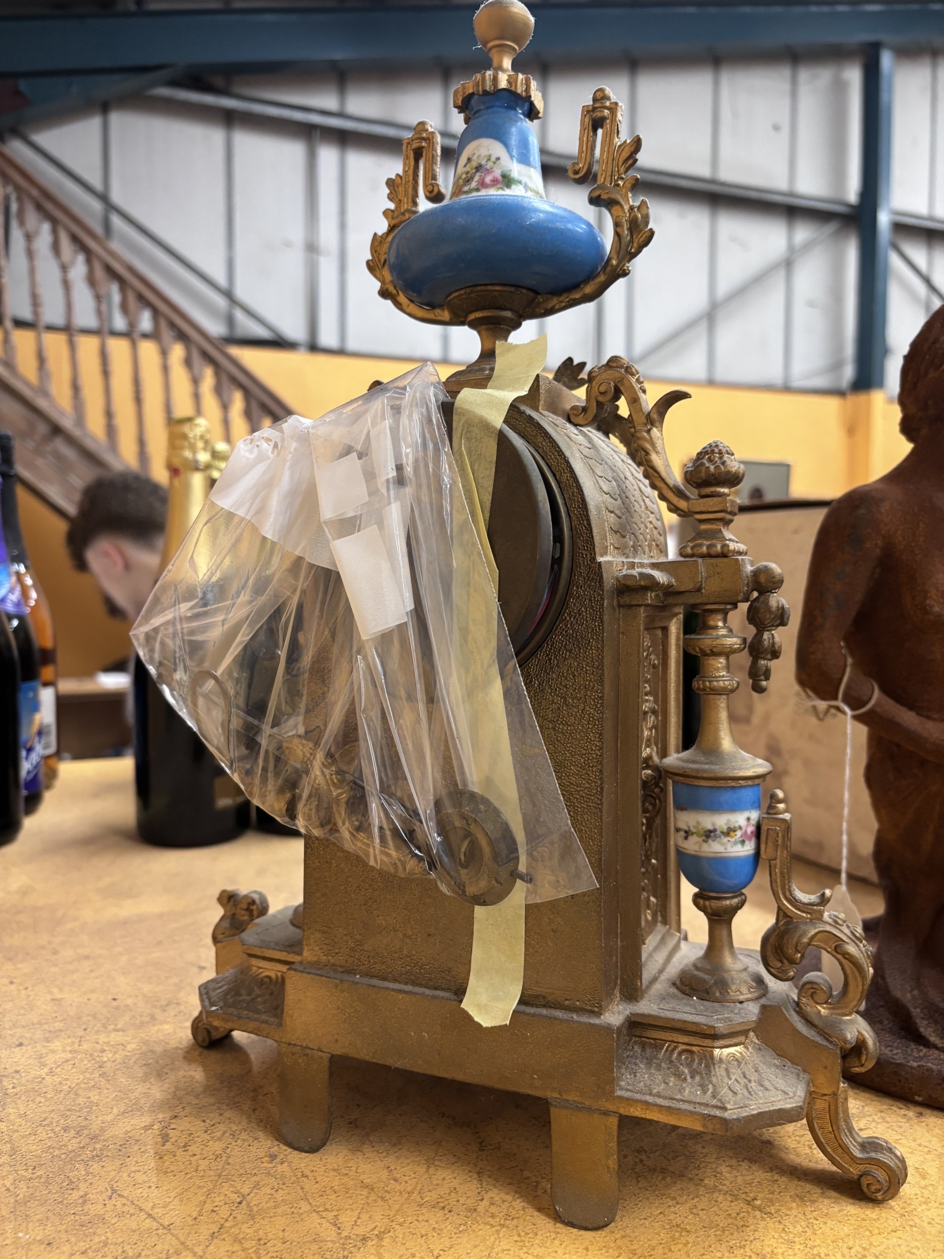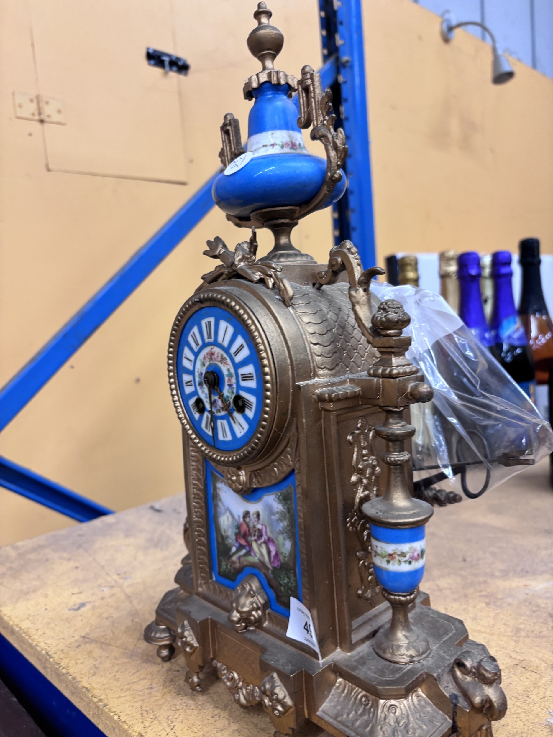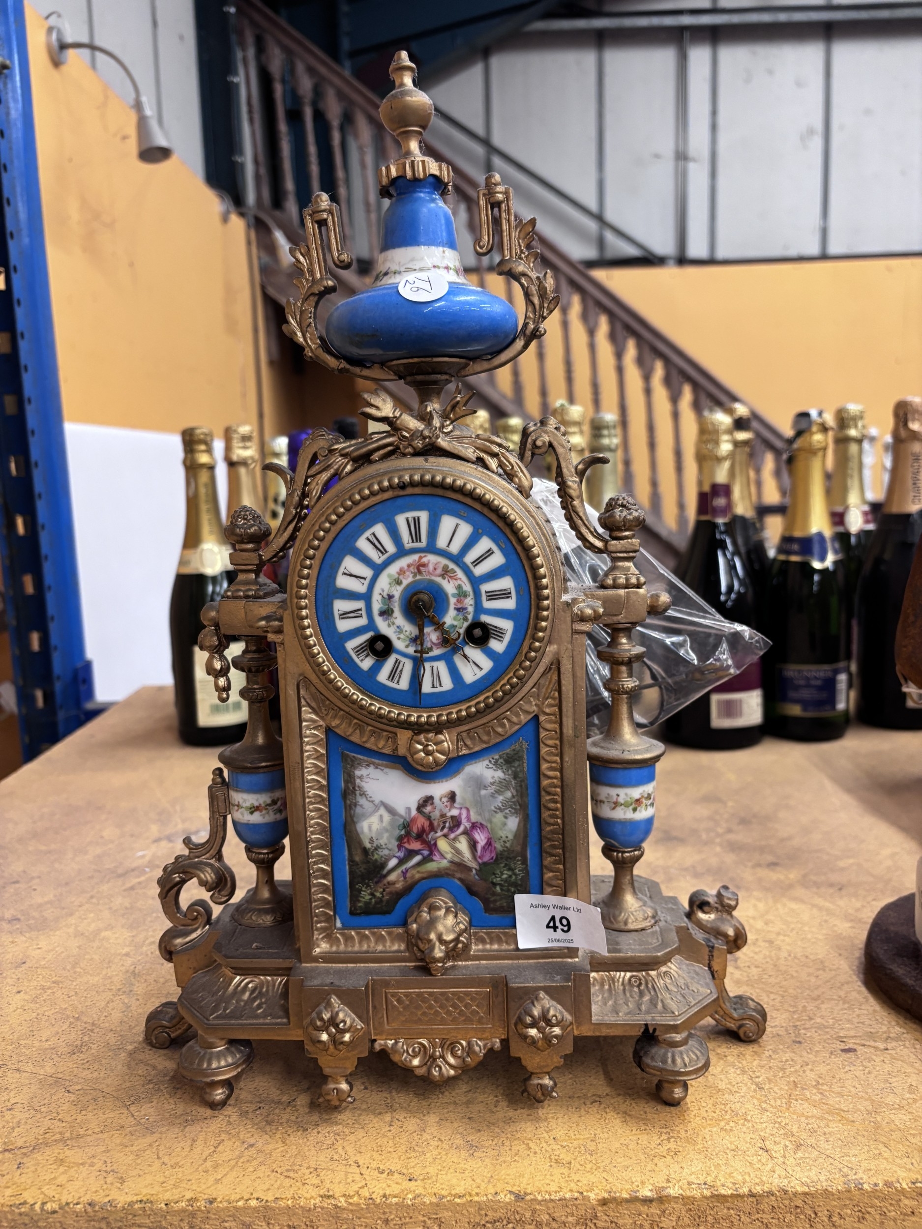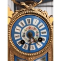 AN ANTIQUE FRENCH CLOCK WITH PORCELAIN BODIED PANELS, WITH KEY AND PENDULUM, HEIGHT APPROX 42CM
