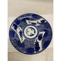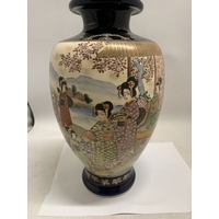 A LARGE JAPANESE SATSUMA INCENSE BURNER WITH POLYCHROME DECORATION OF CHARACTERS WITH DRAGON SHAPED HANDLES AND FEET WITH FOO DOG FINIAL - APPROX 29 CM