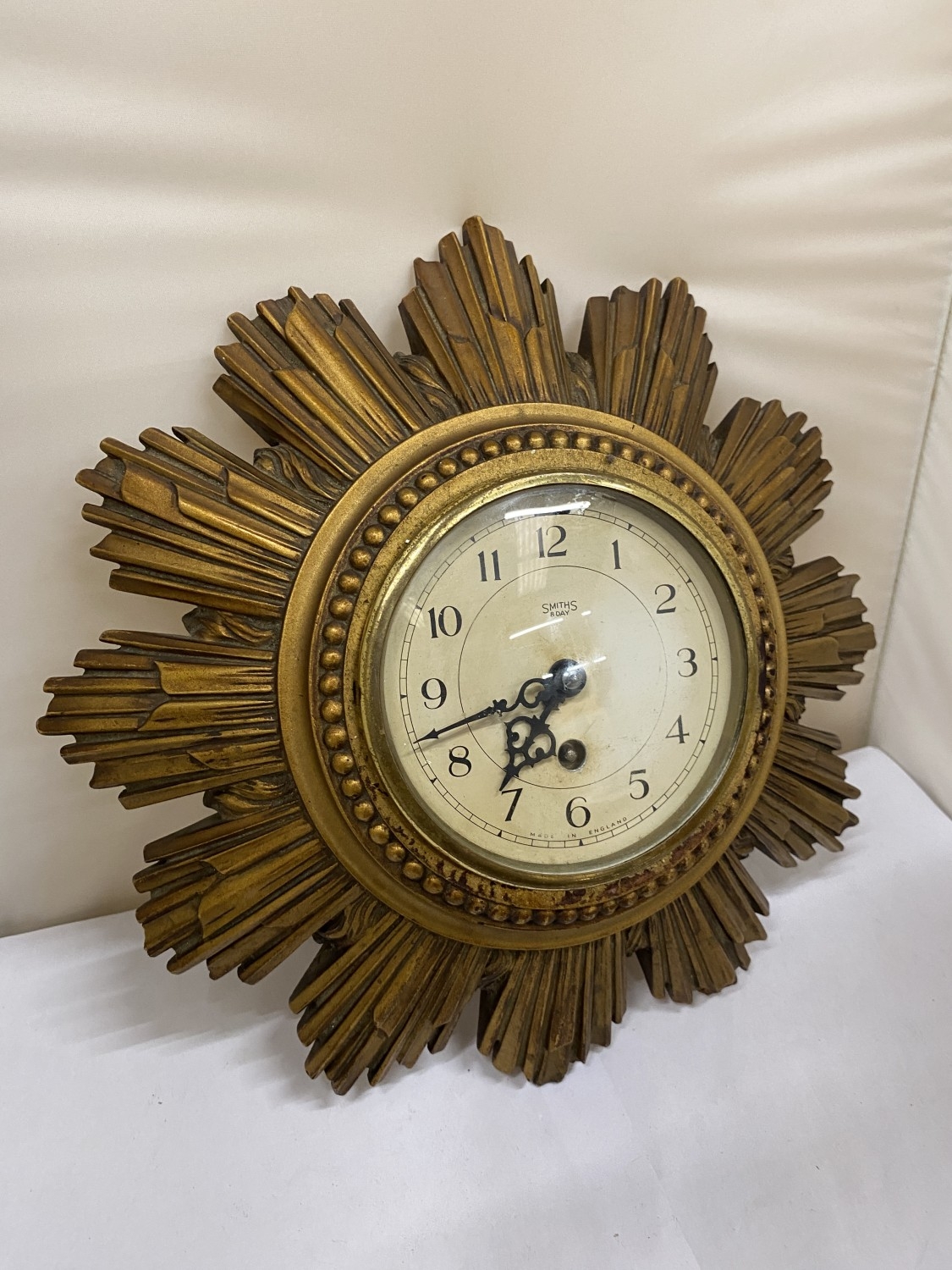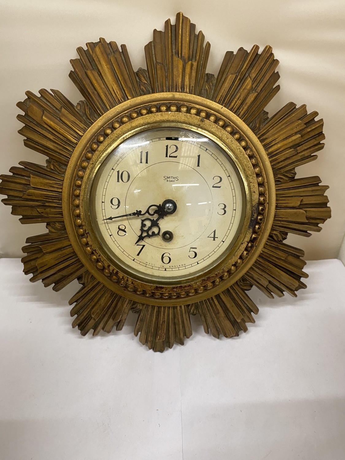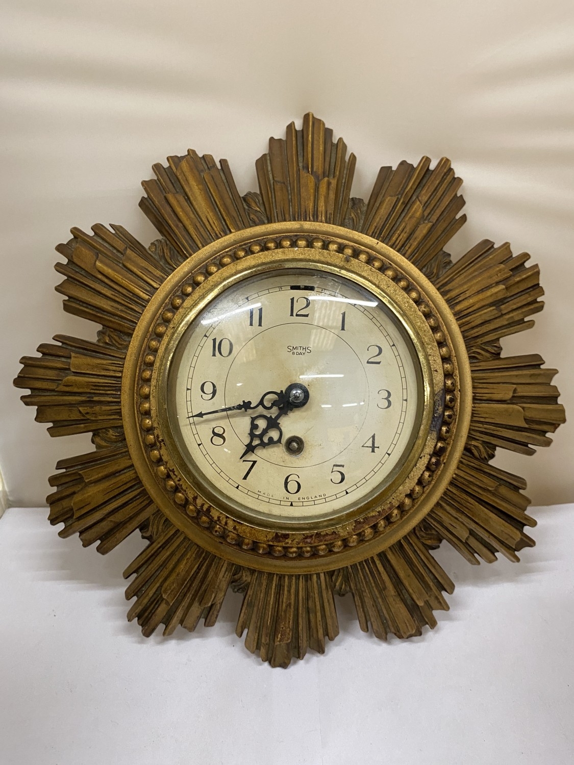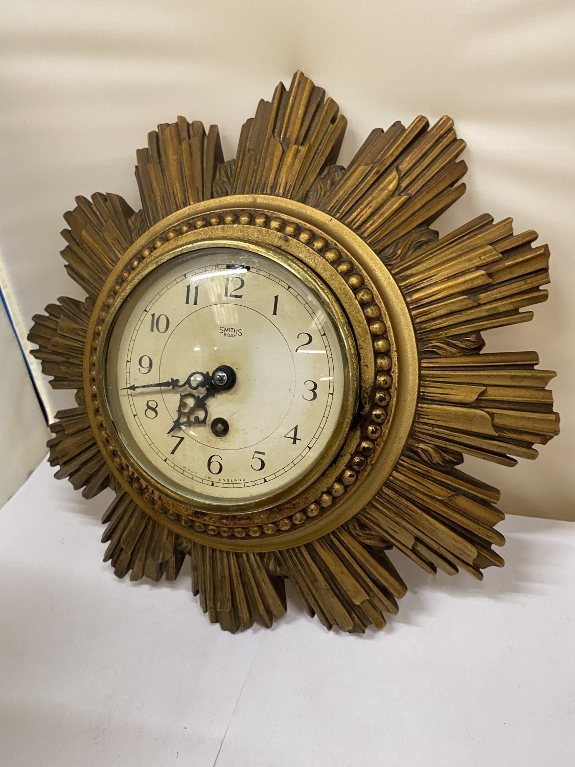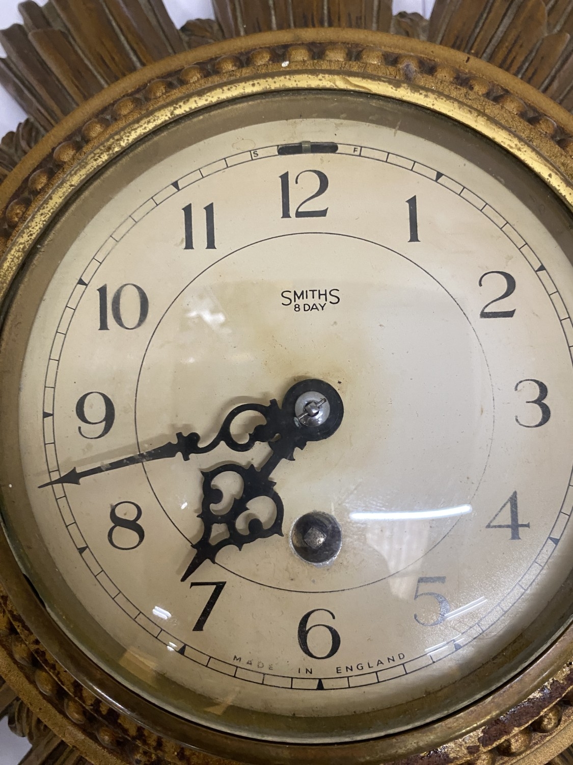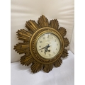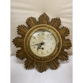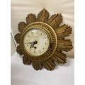 A SMITHS GILT 8 DAY SUNBURST CLOCK, DIAMETER 30CM (KEY IN OFFICE)