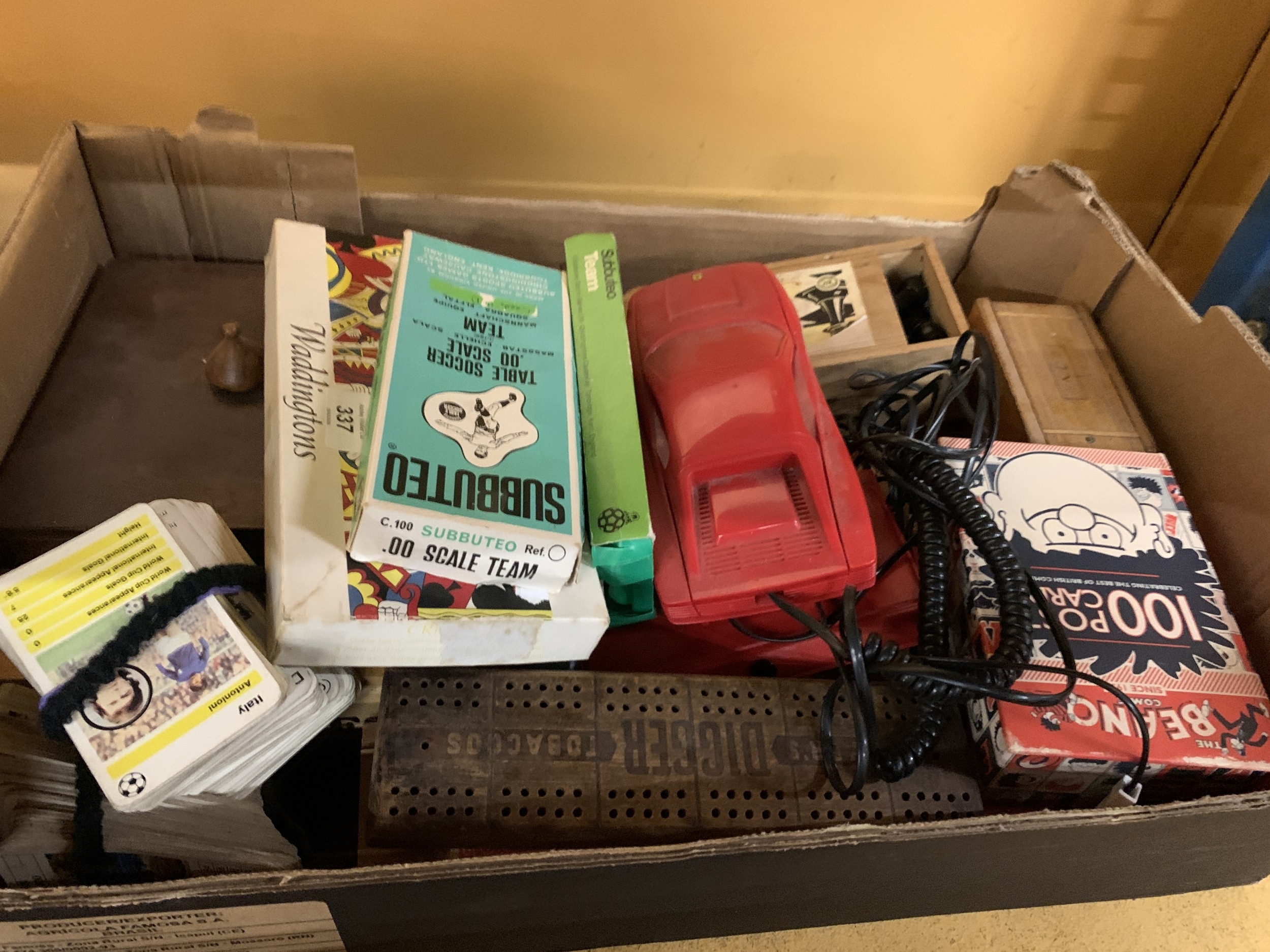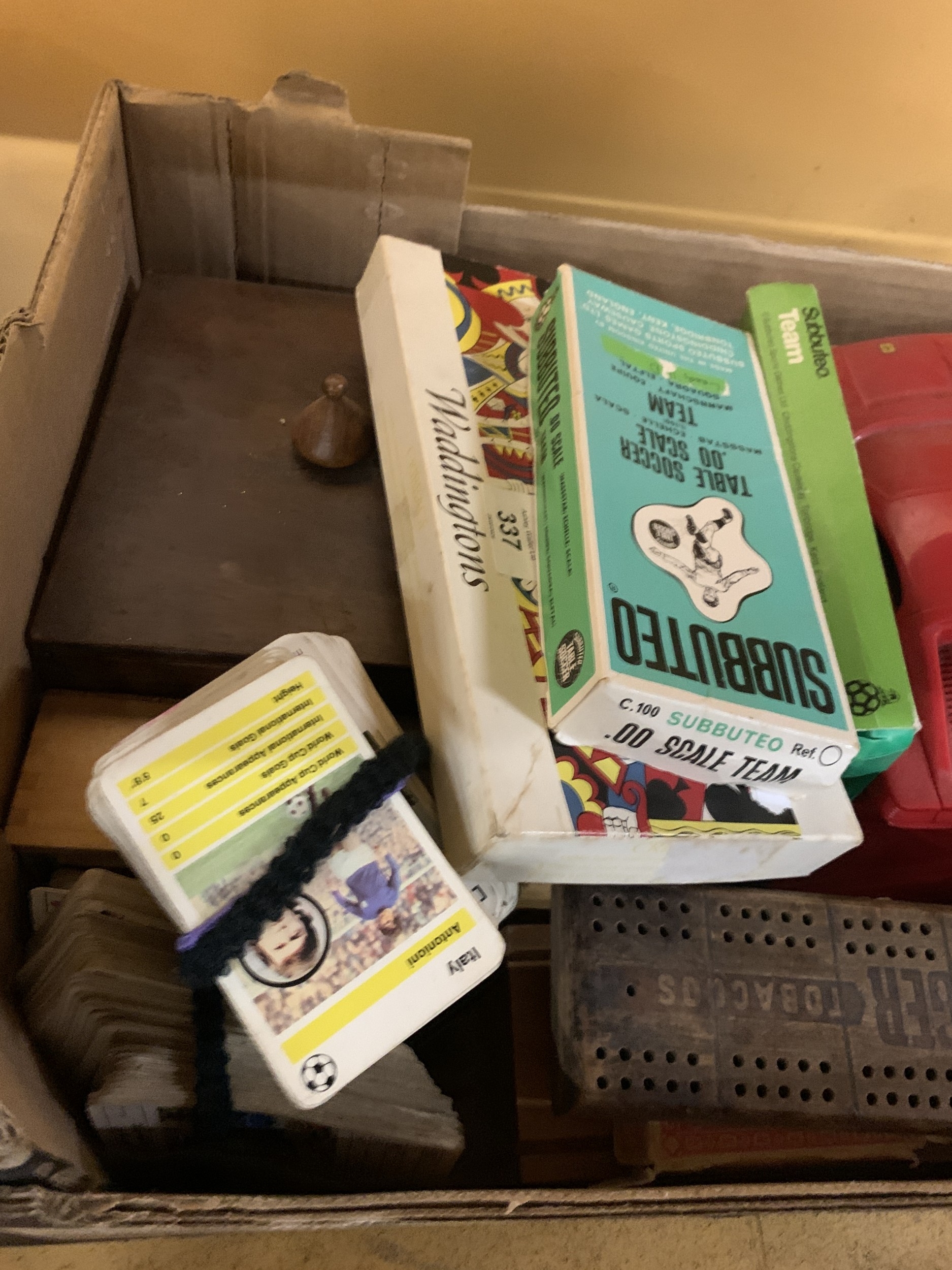 AN ASSORTMENT OF GAMES TO INLCUDE CHESS PIECES, TOP TRUMPS STYLE CARDS, DOMINOS, CRIBBAGE, SUBUTEO TEAMS ETC