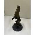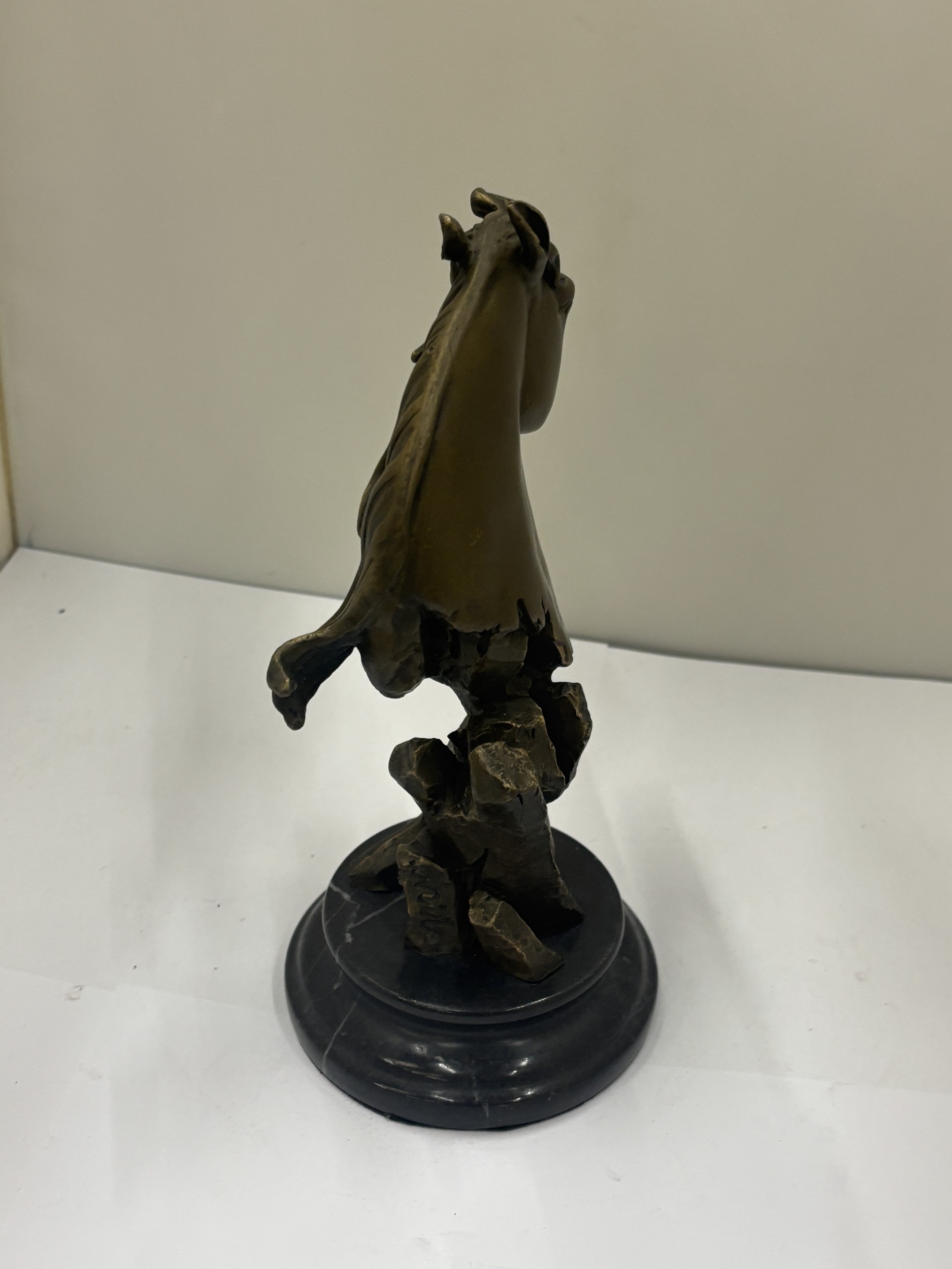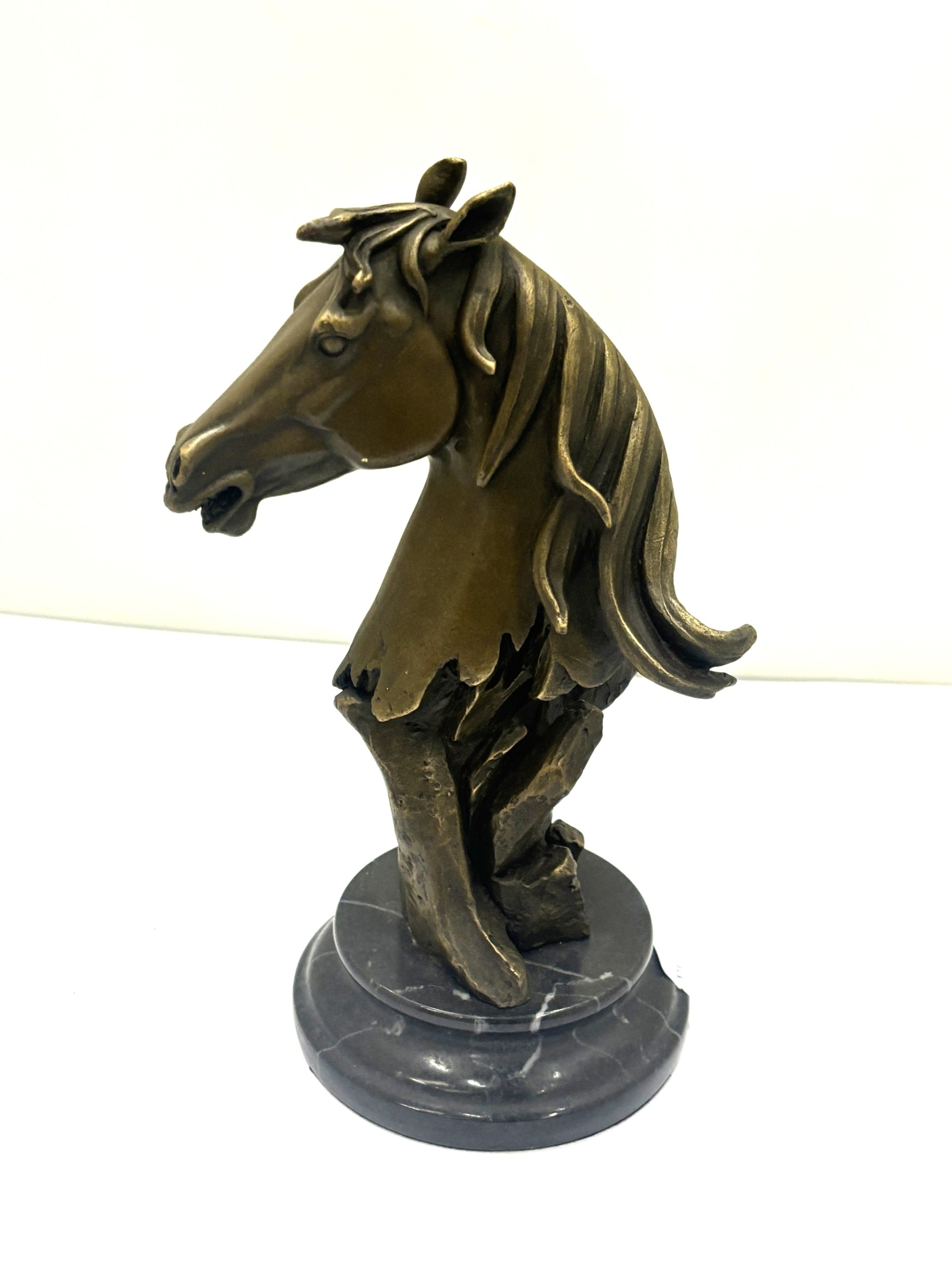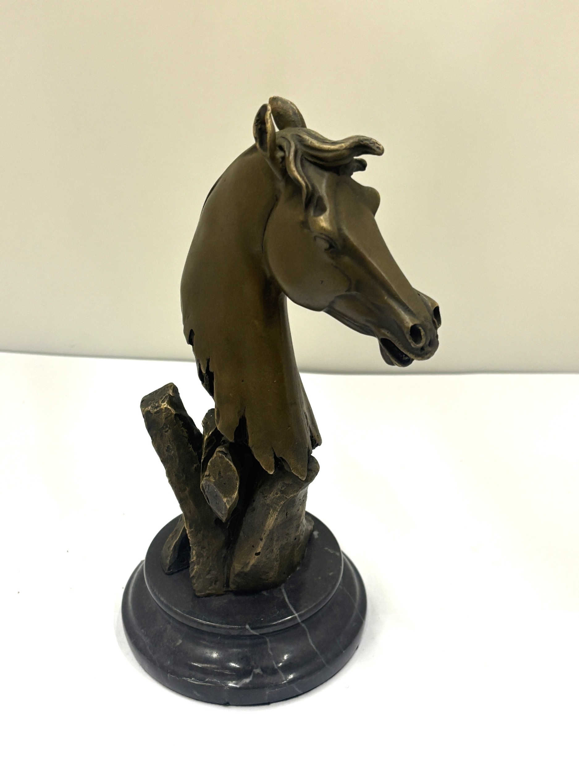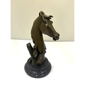 A BRONZE BUST OF A HORSE'S HEAD ON A MARBLE BASE, HEIGHT 22CM