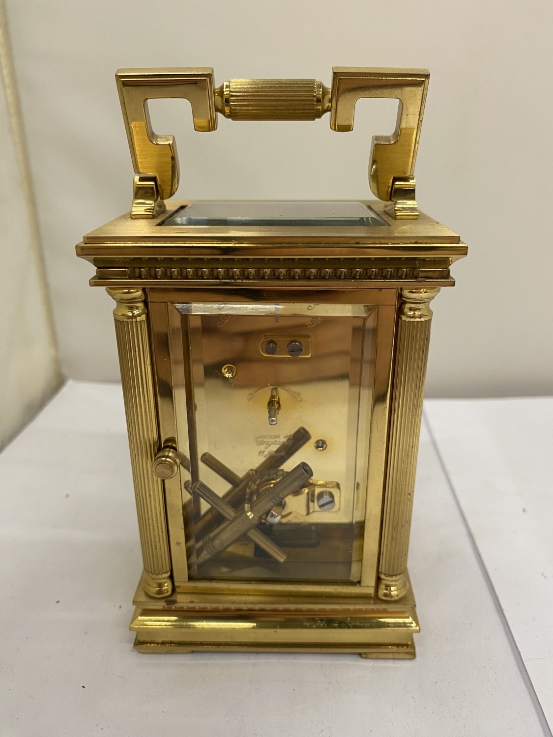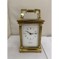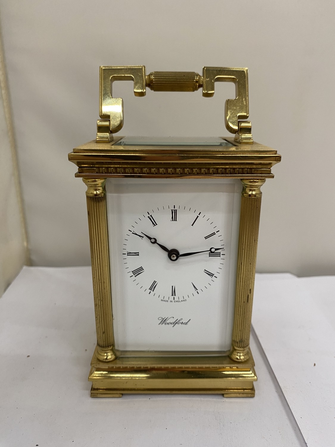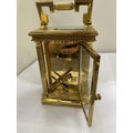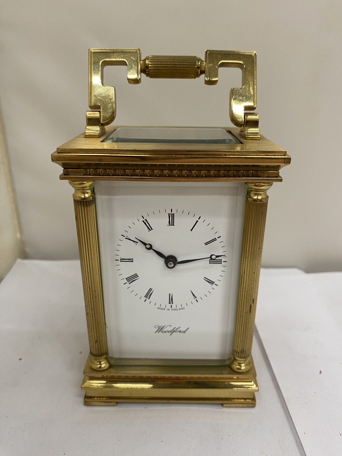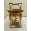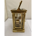 A VINTAGE WOODFORD BRASS CARRIAGE CLOCK, WITH KEY, WORKING AT TIME OF CATALOGUING