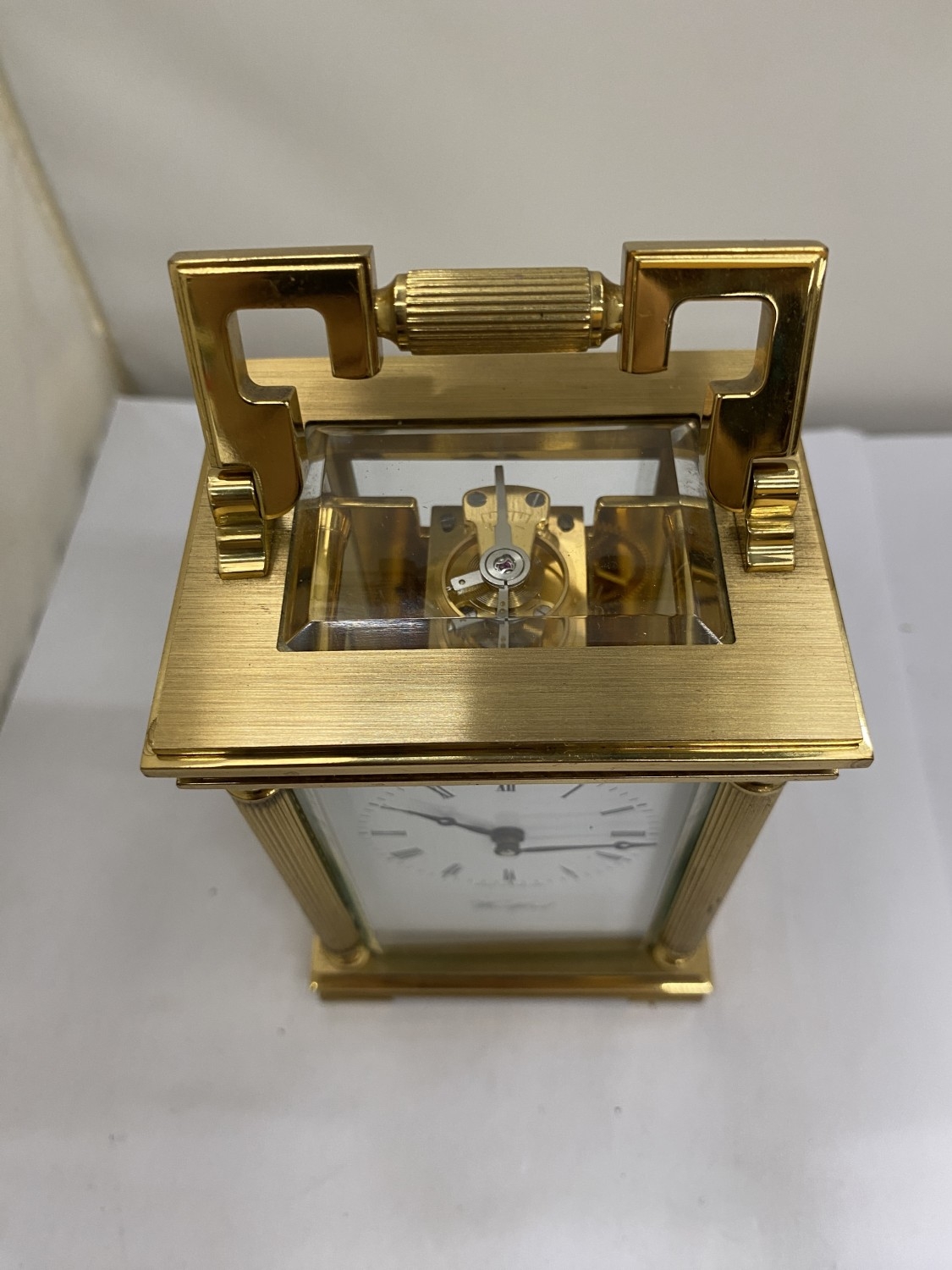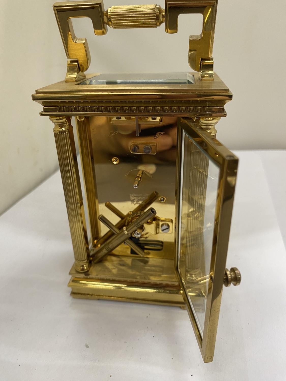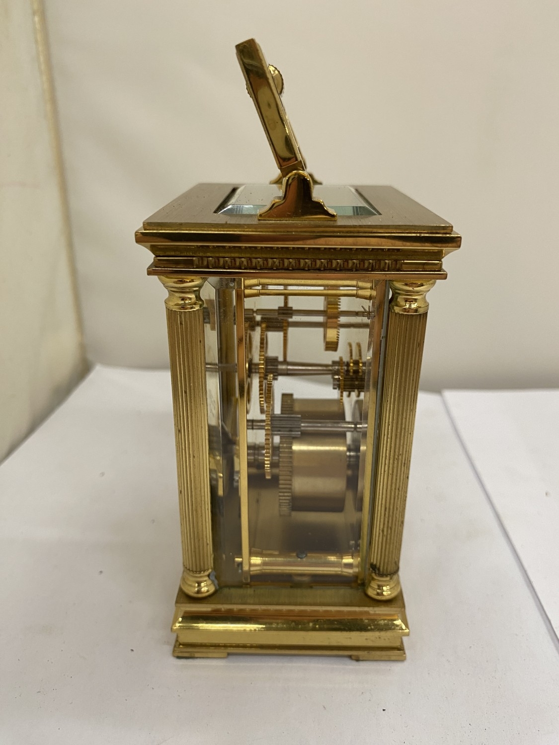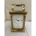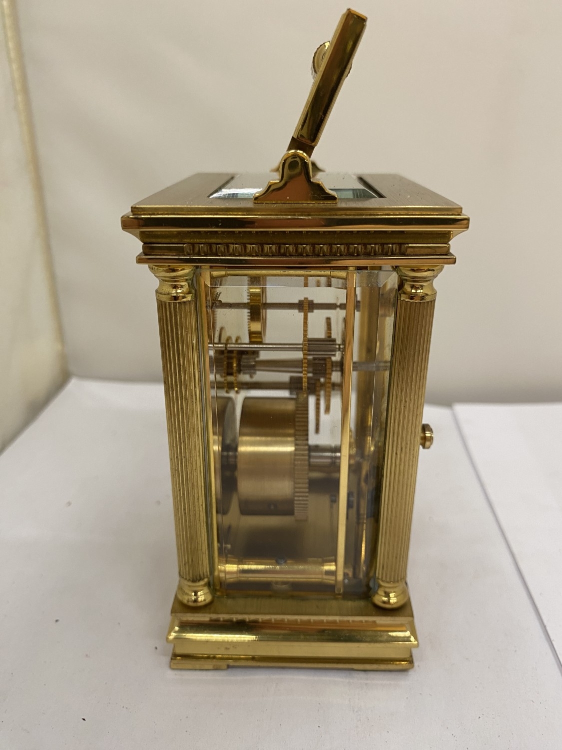 A VINTAGE WOODFORD BRASS CARRIAGE CLOCK, WITH KEY, WORKING AT TIME OF CATALOGUING