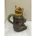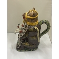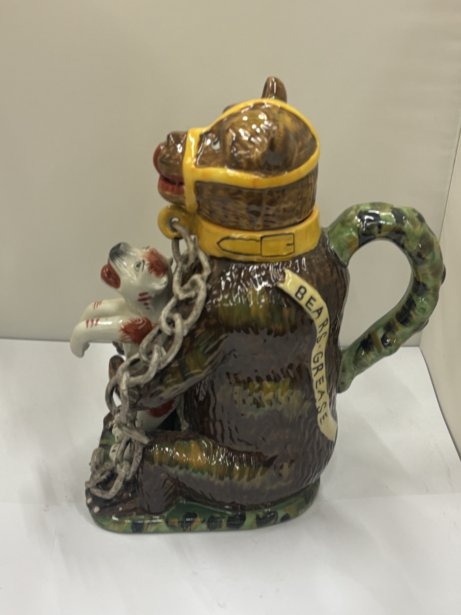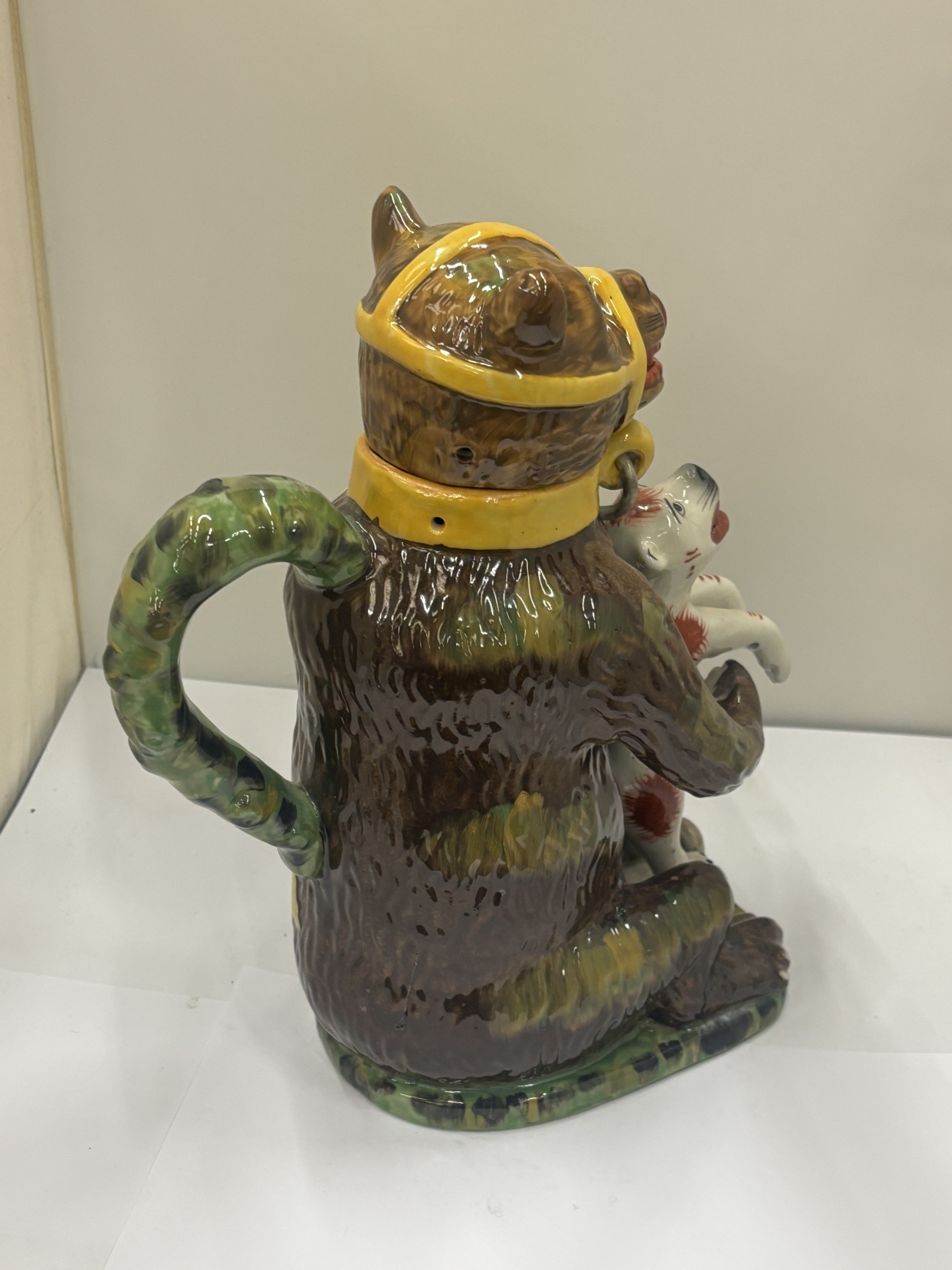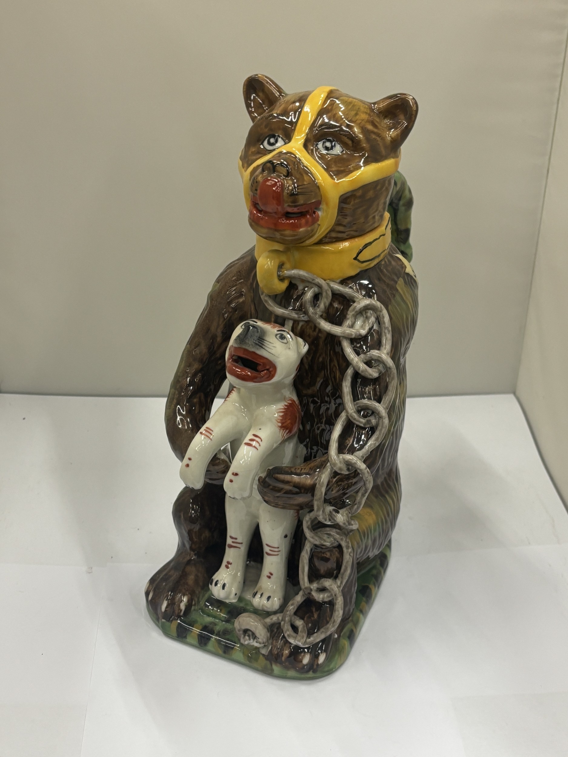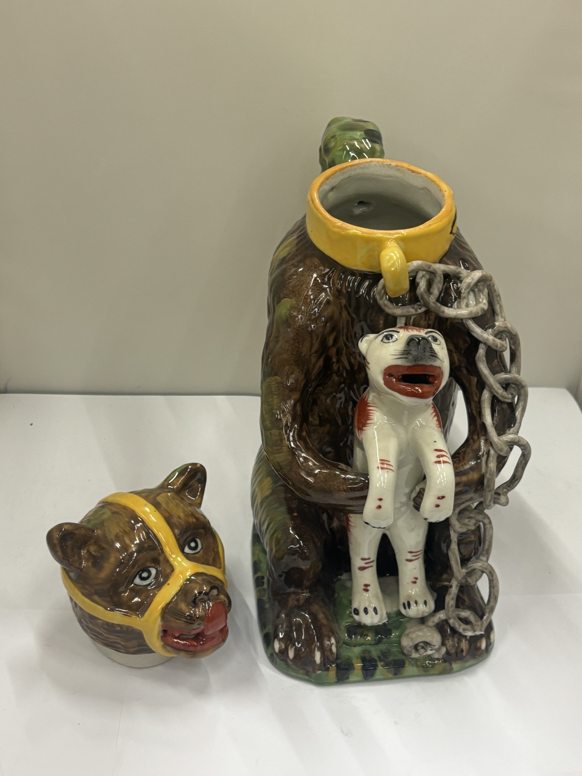 A MAJOLICA STYLE BEAR JUG DEPICTING A CHAINED BEAR HOLDING A DOG, HEIGHT 29CM