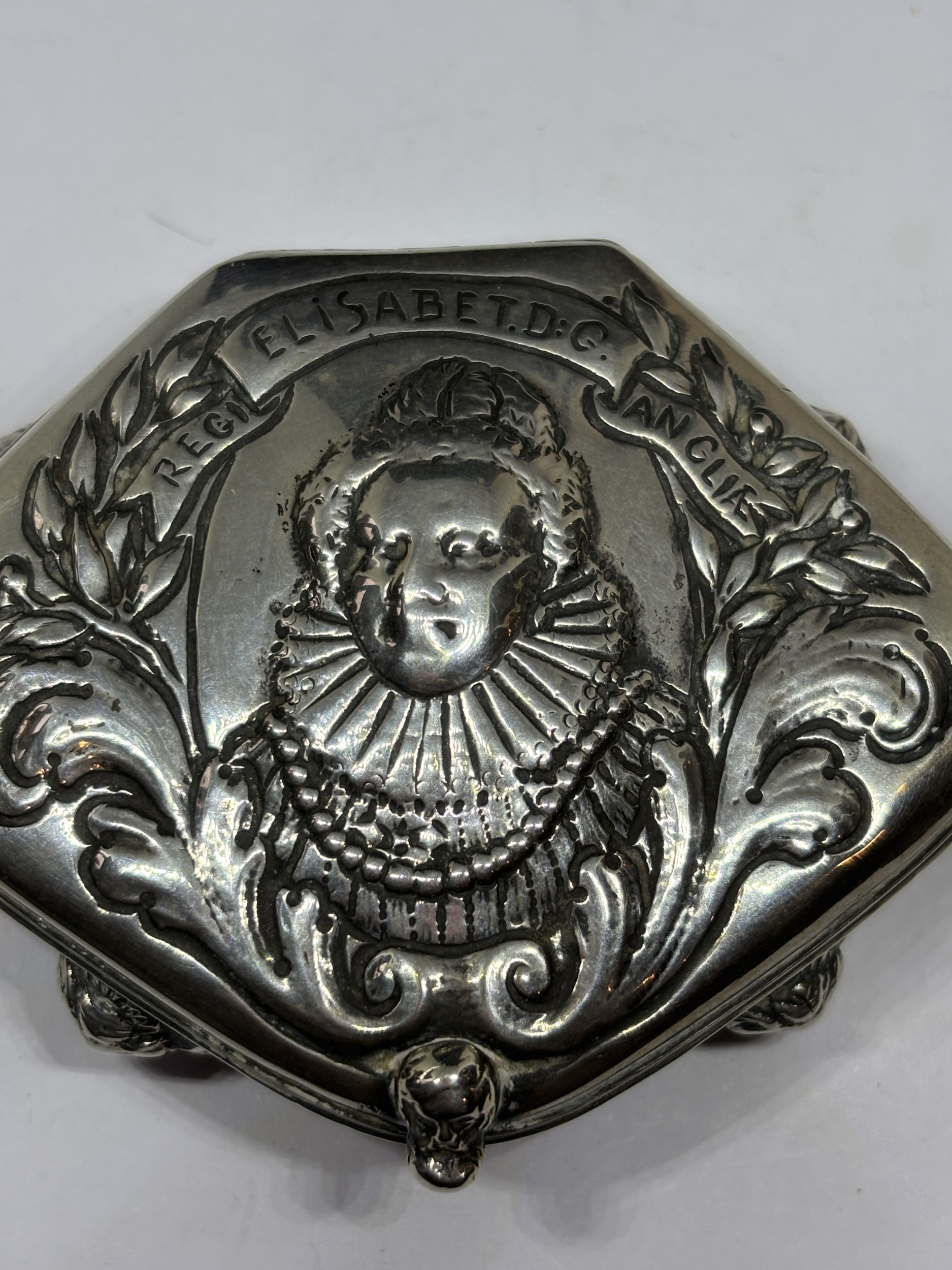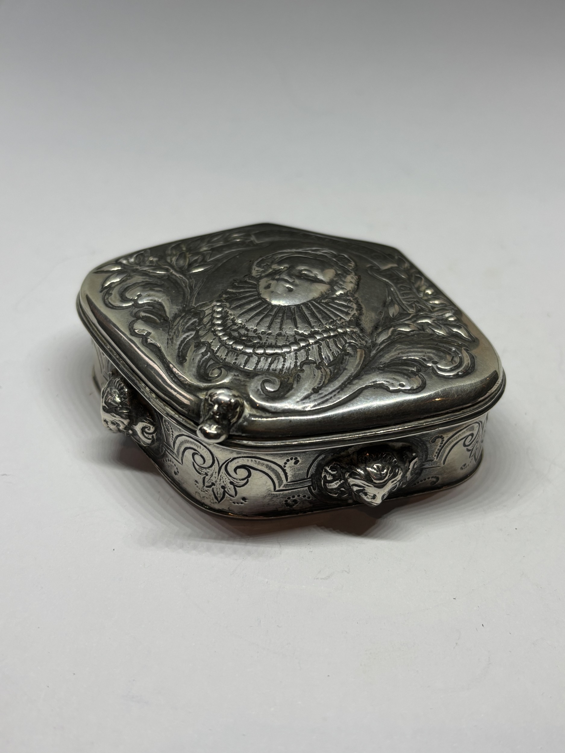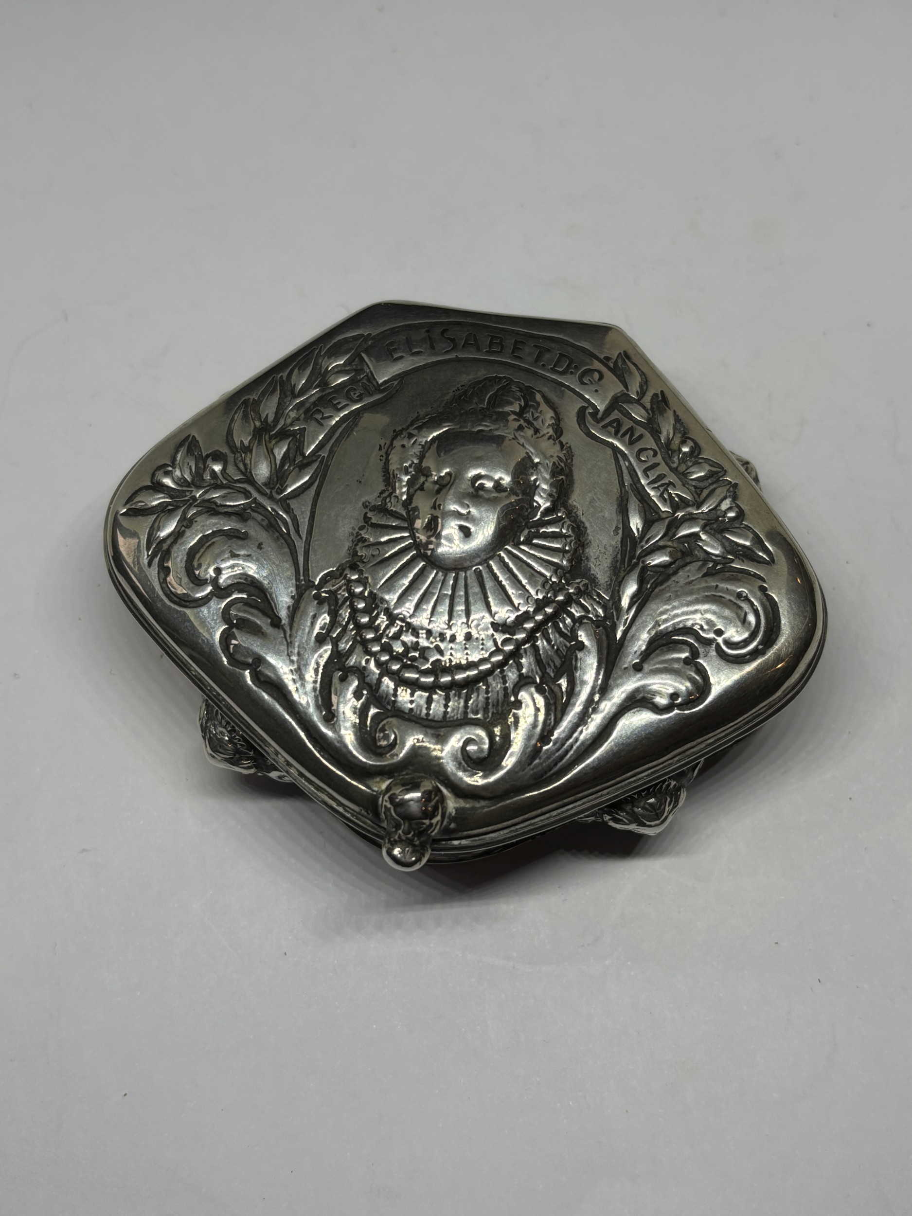 A BELIEVED 19TH CENTURY DUTCH SILVER SNUFF BOX WITH REPOUSSE BUST OF QUEEN ELIZABETH I GROSS WEIGHT 76.3 GRAMS