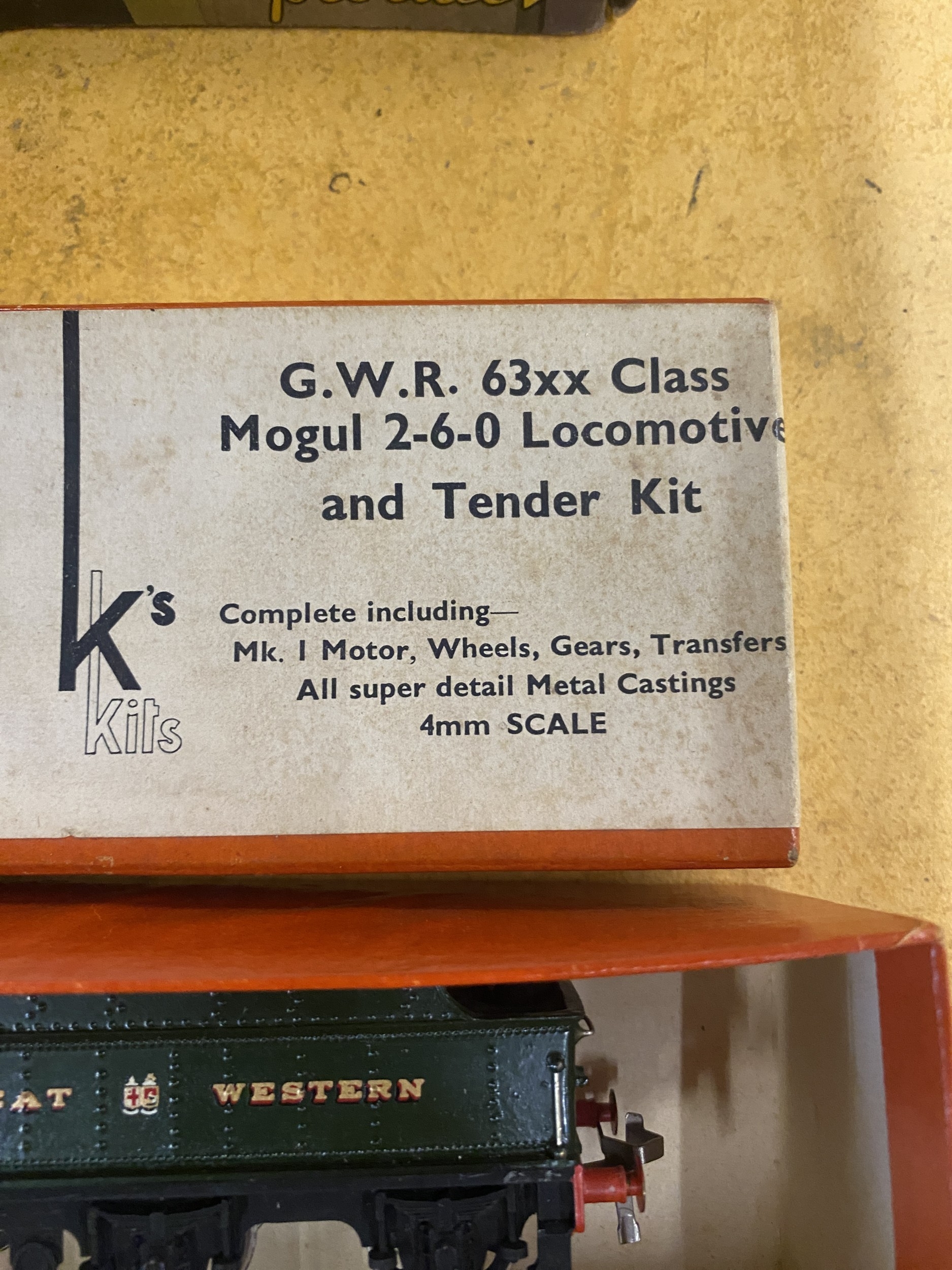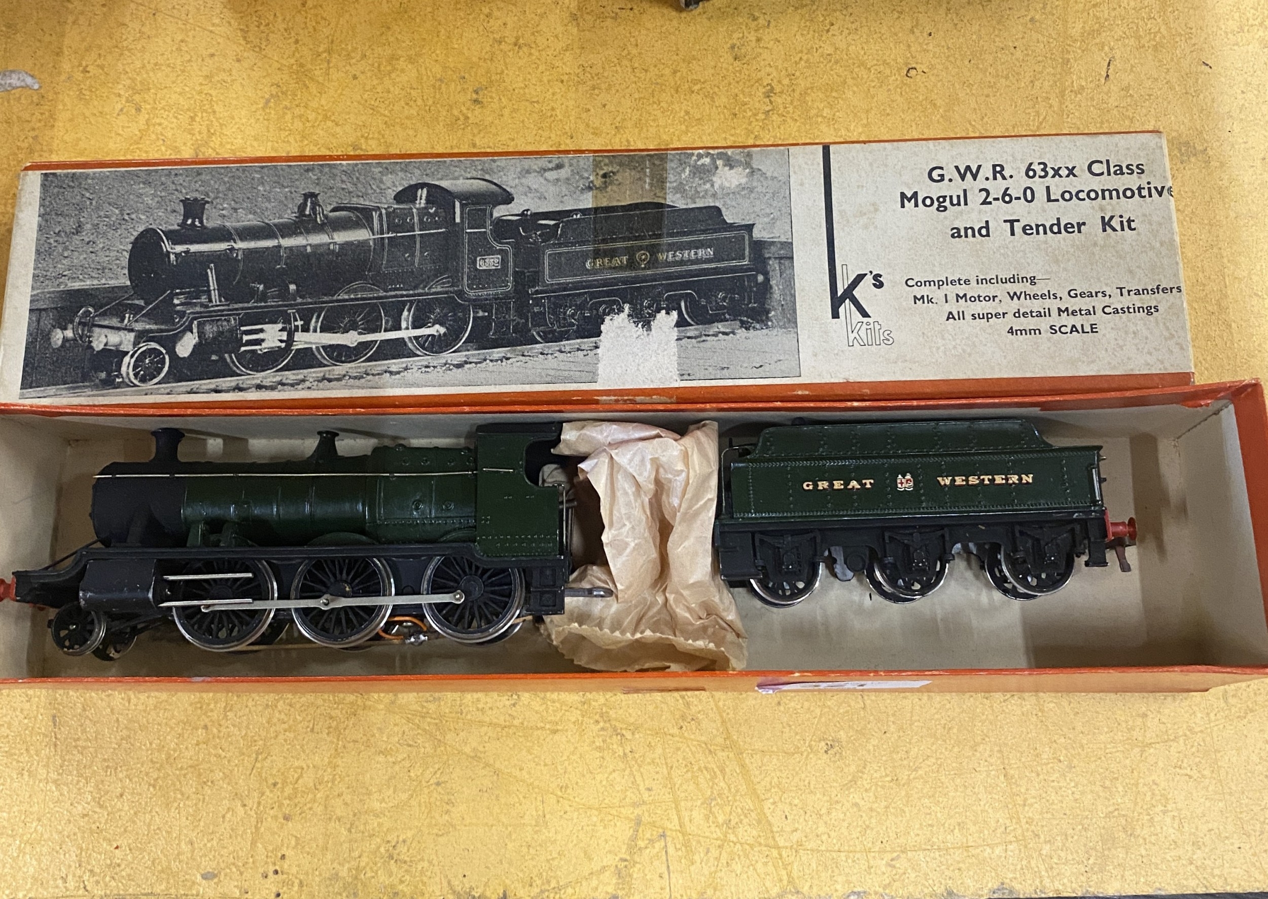 A VINTAGE K'S KITS, G. W. R. 63xx CLASS MOGUL 2-6-0 LOCOMOTIVE AND TENDER, 4mm SCALE, IN ORIGINAL BOX