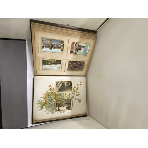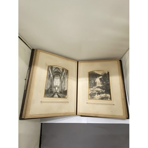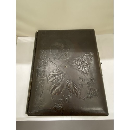 A LEATHER BOUND VICTORIAN PHOTO ALBUM, CONTAINING PHOTOS AND POSTCARDS