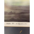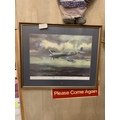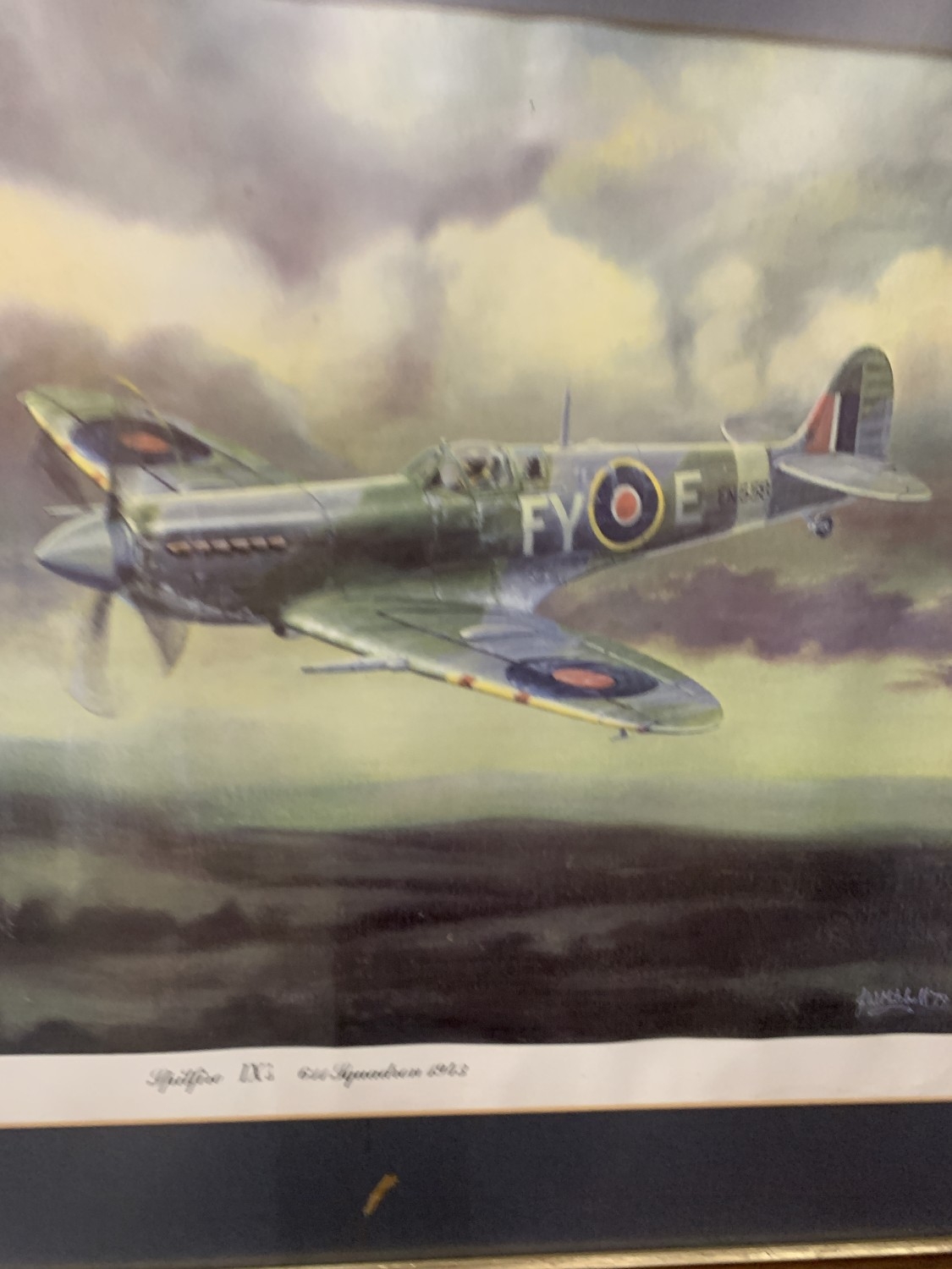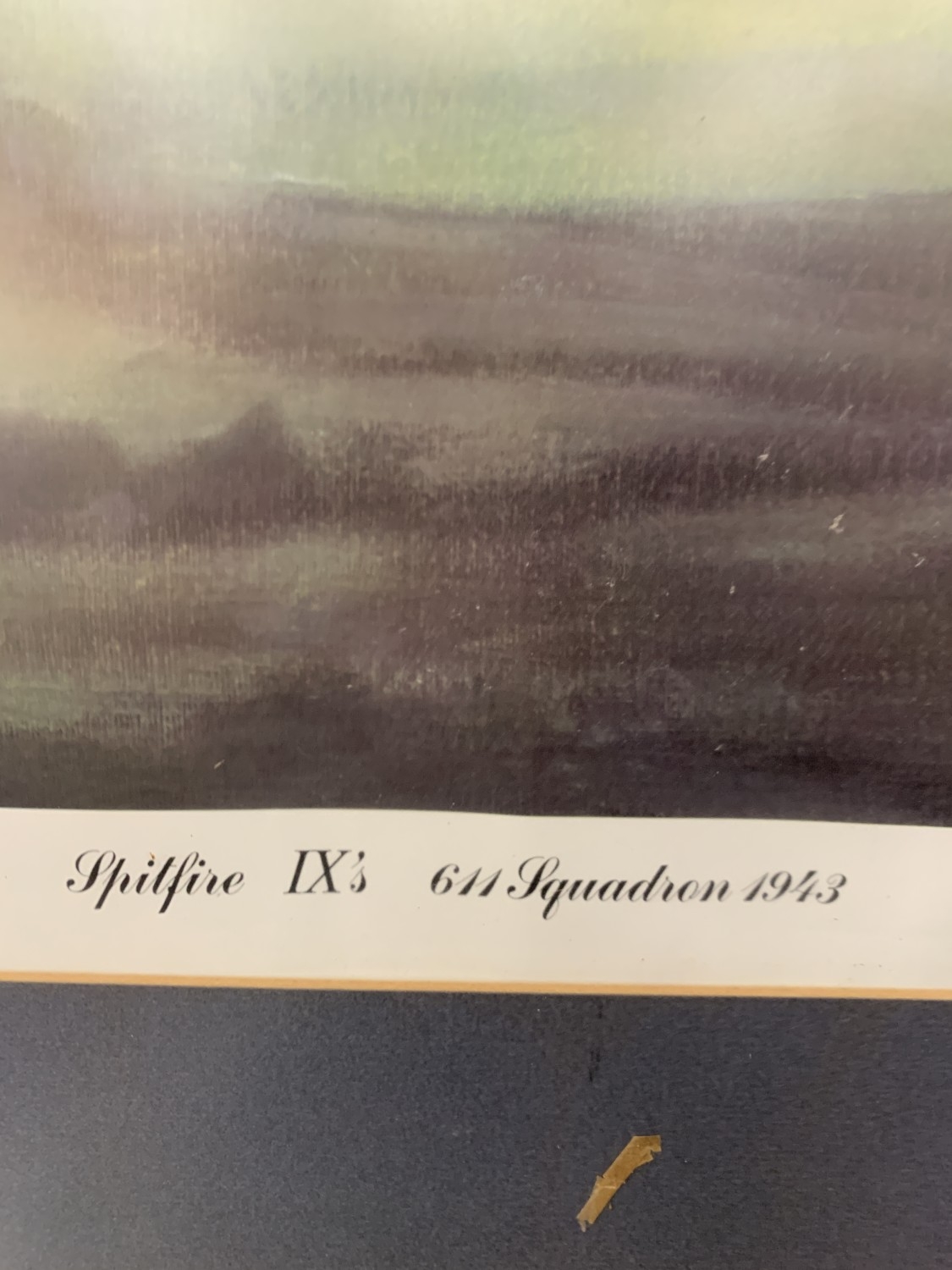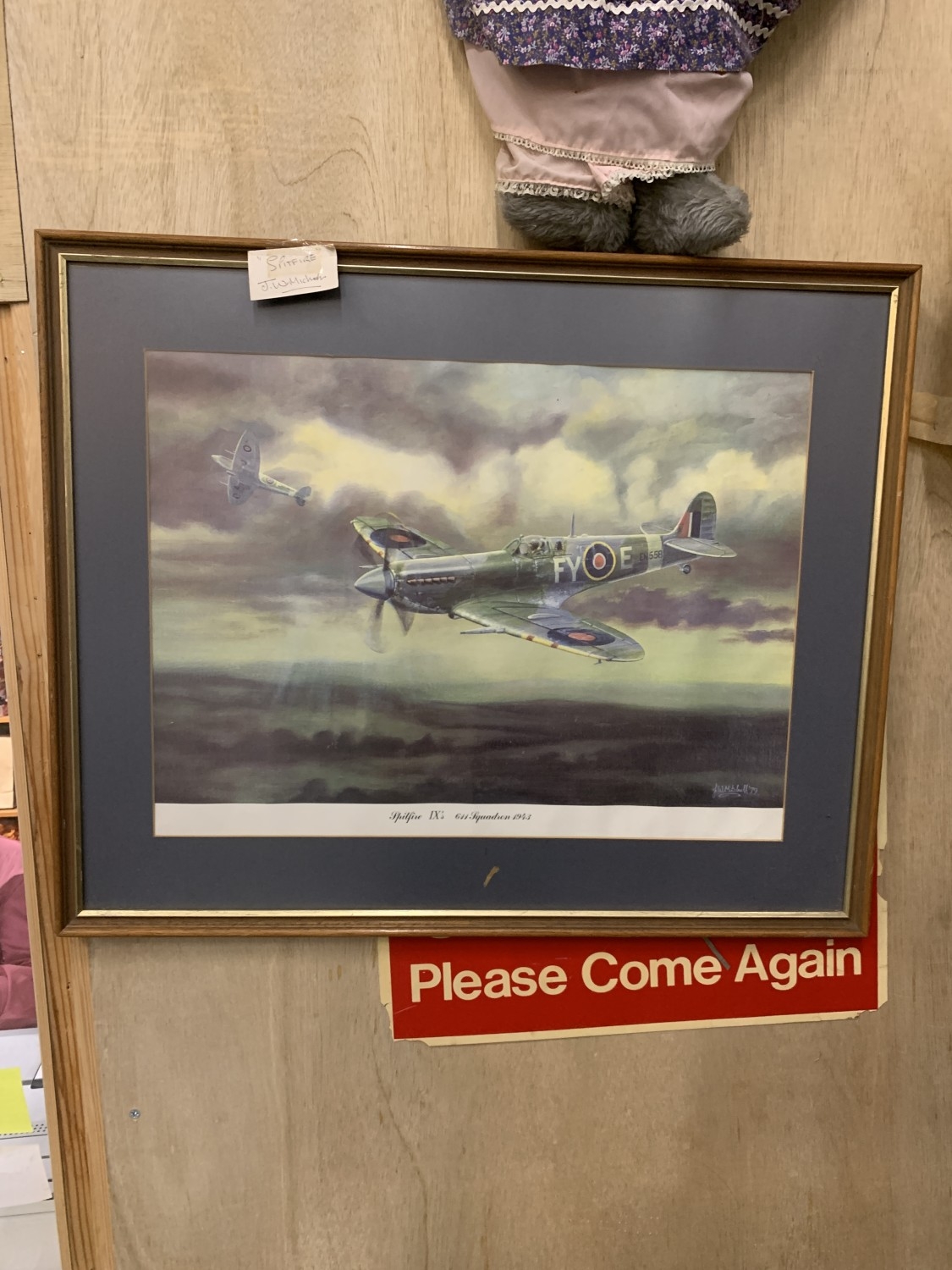 A FRAMED AND GLAZED COLOURED PRINT OF A SPITFIRE, 44CM X 60CM