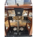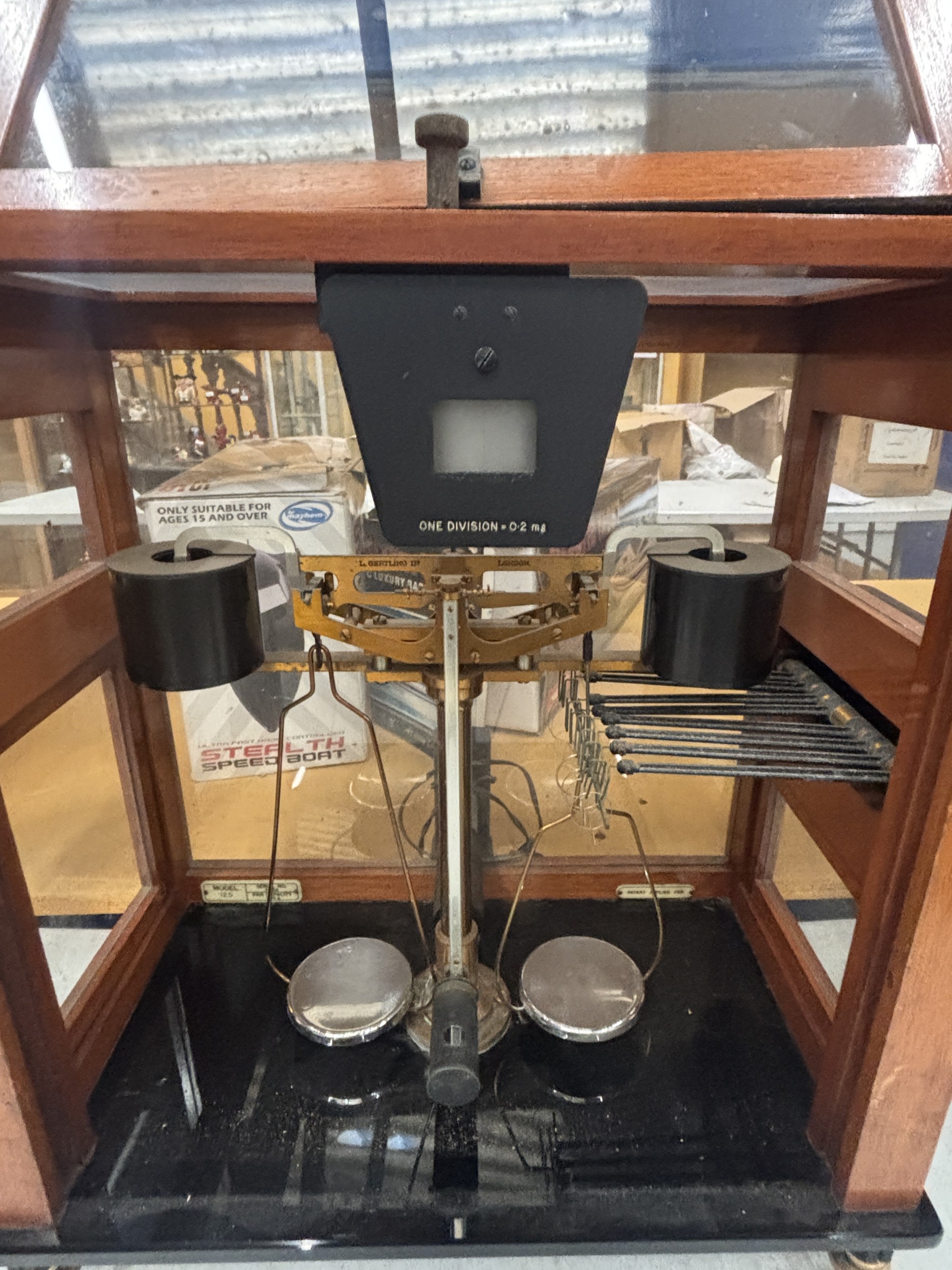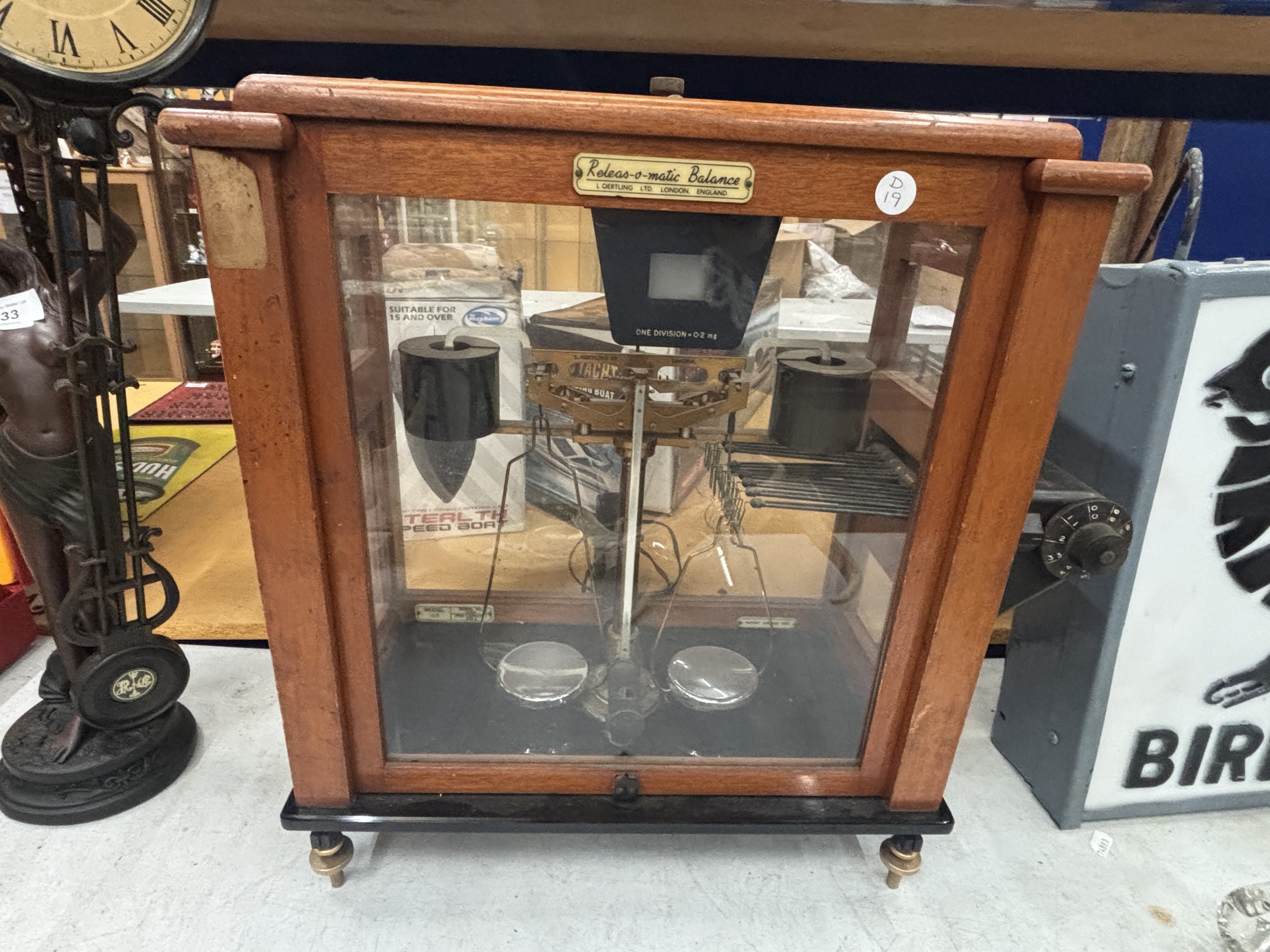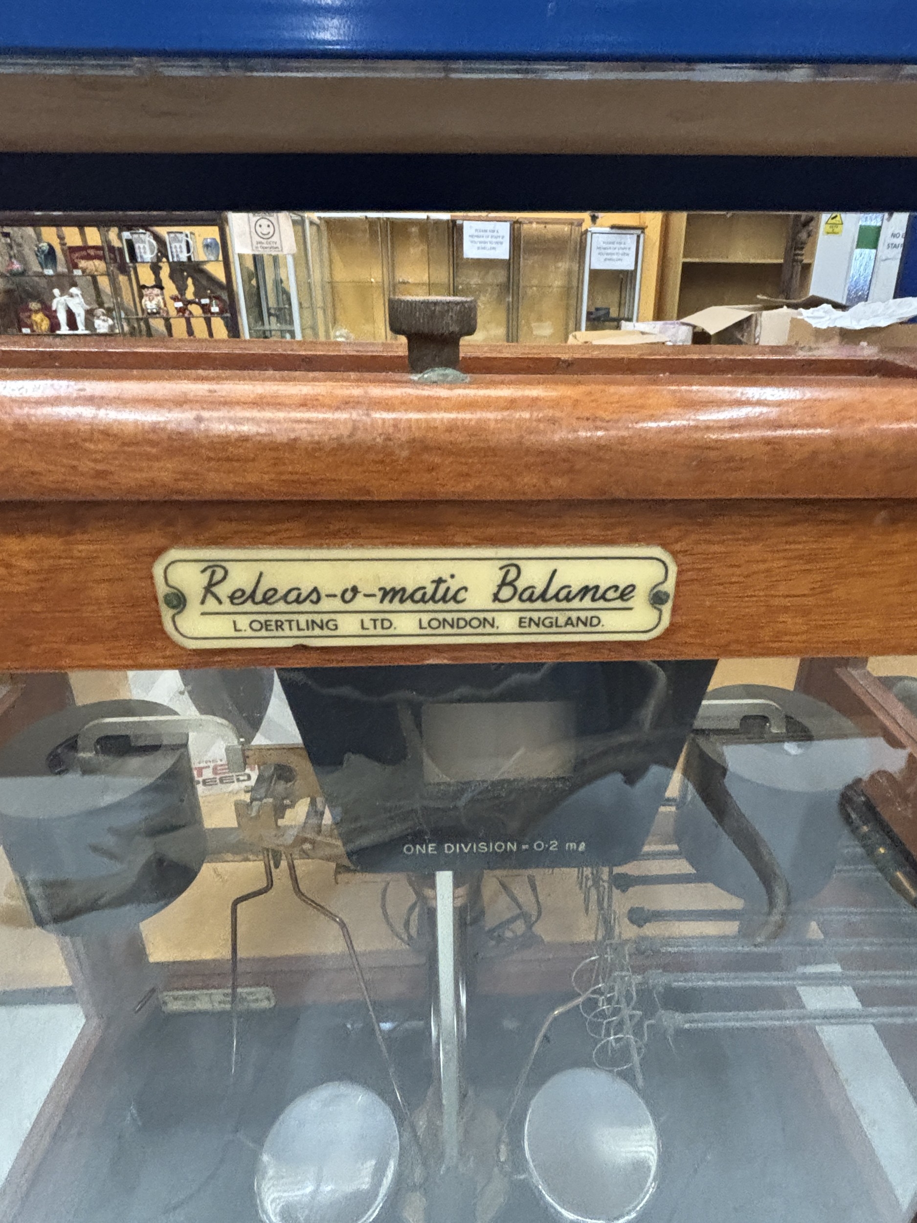 A SET OF VINTAGE RELEAS-O-MATIC BALANCE SCALES IN A WOOD AND GLASS CASE, FROM L OERTLING, LONDON