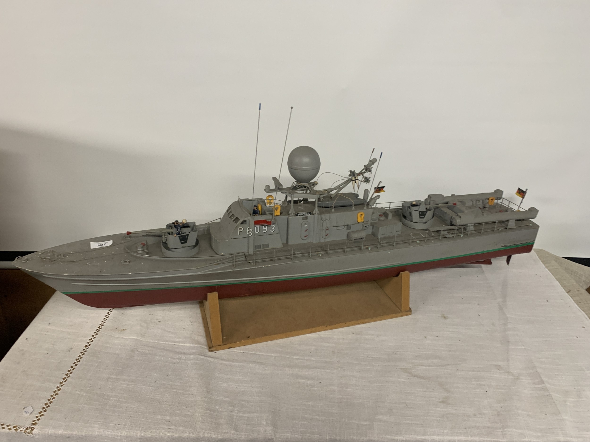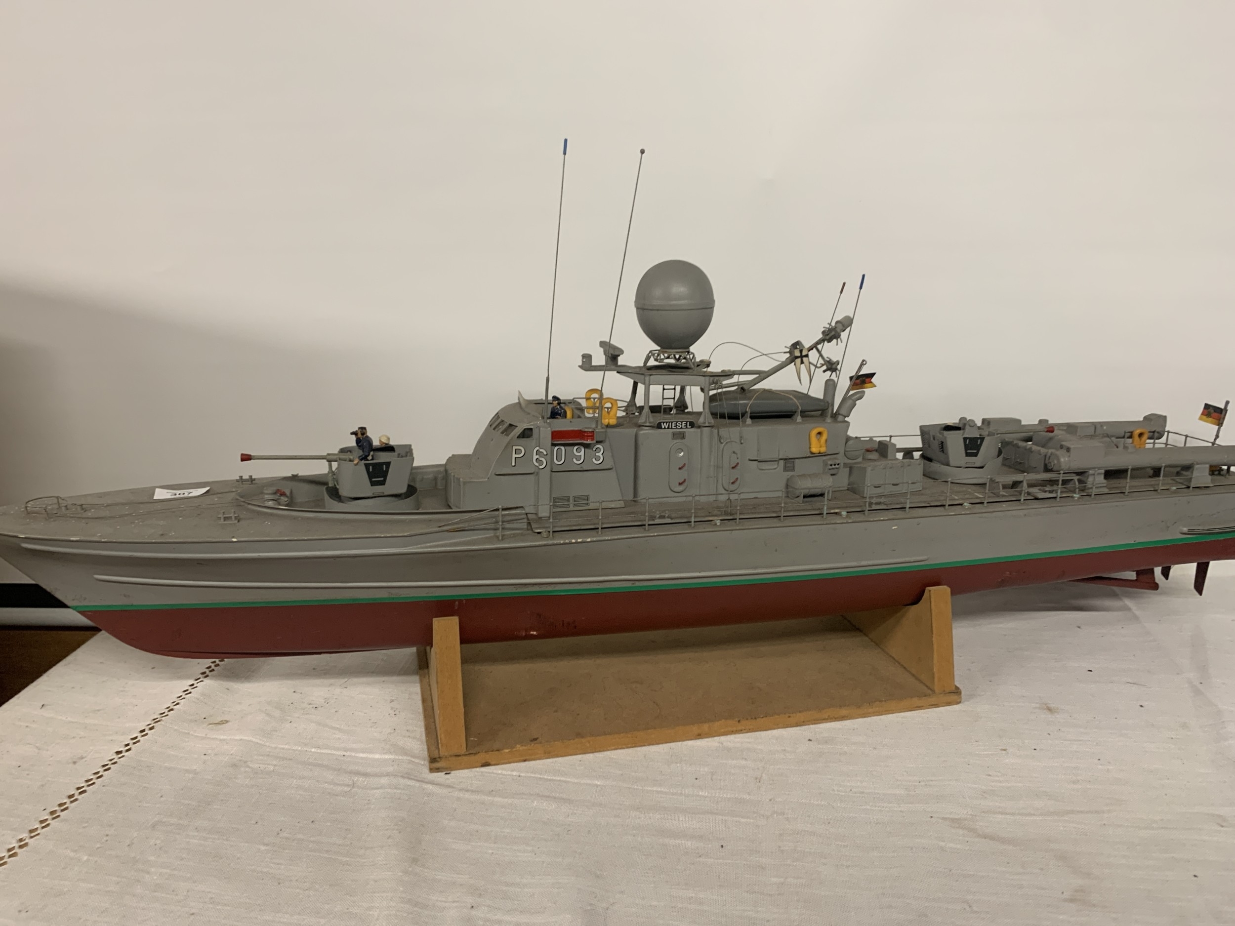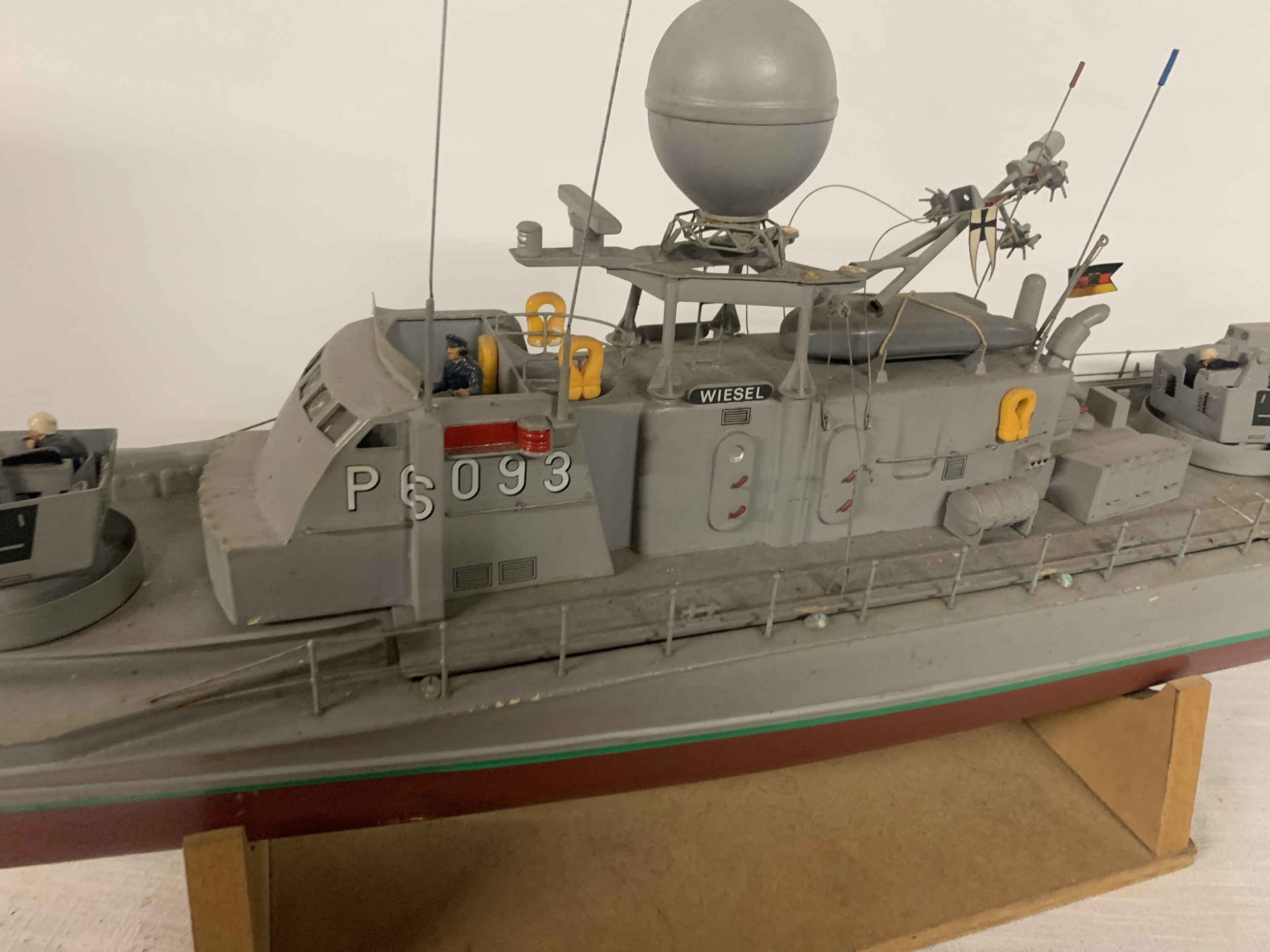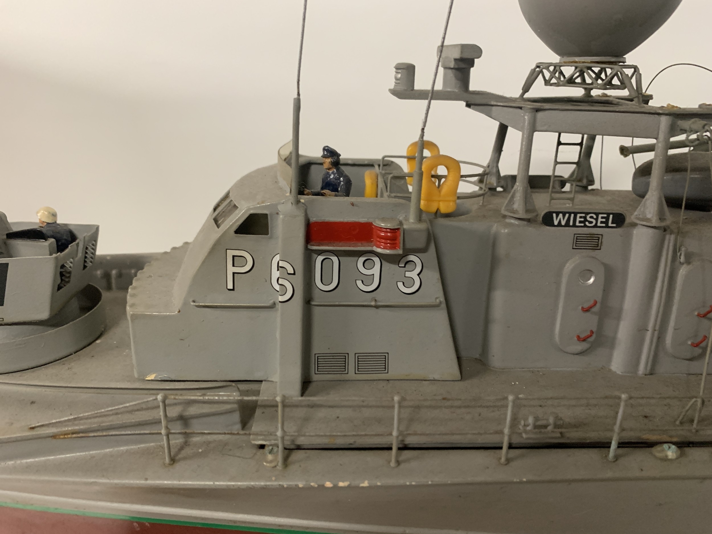 A LARGE MODEL OF A GERMAN NAVY S-100 CLASS TORPEDO BOAT, THE 'WEISEL', LENGTH 107CM, HEIGHT 37CM WITH WOODEN BASE
