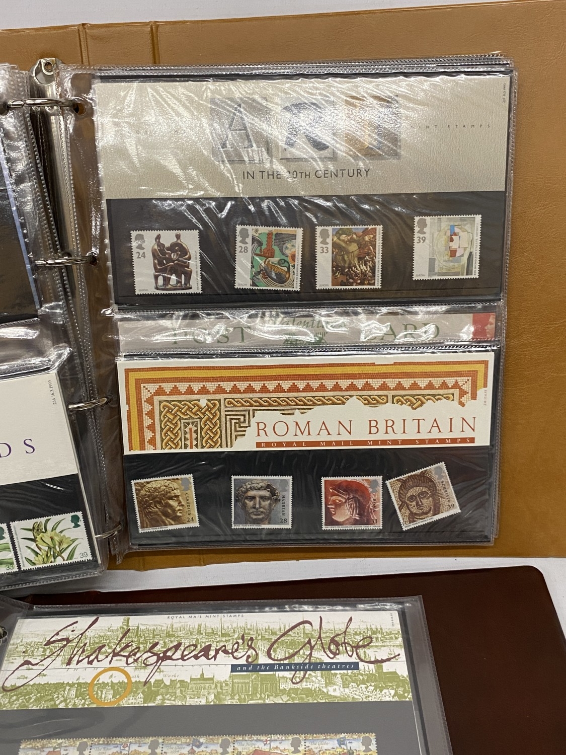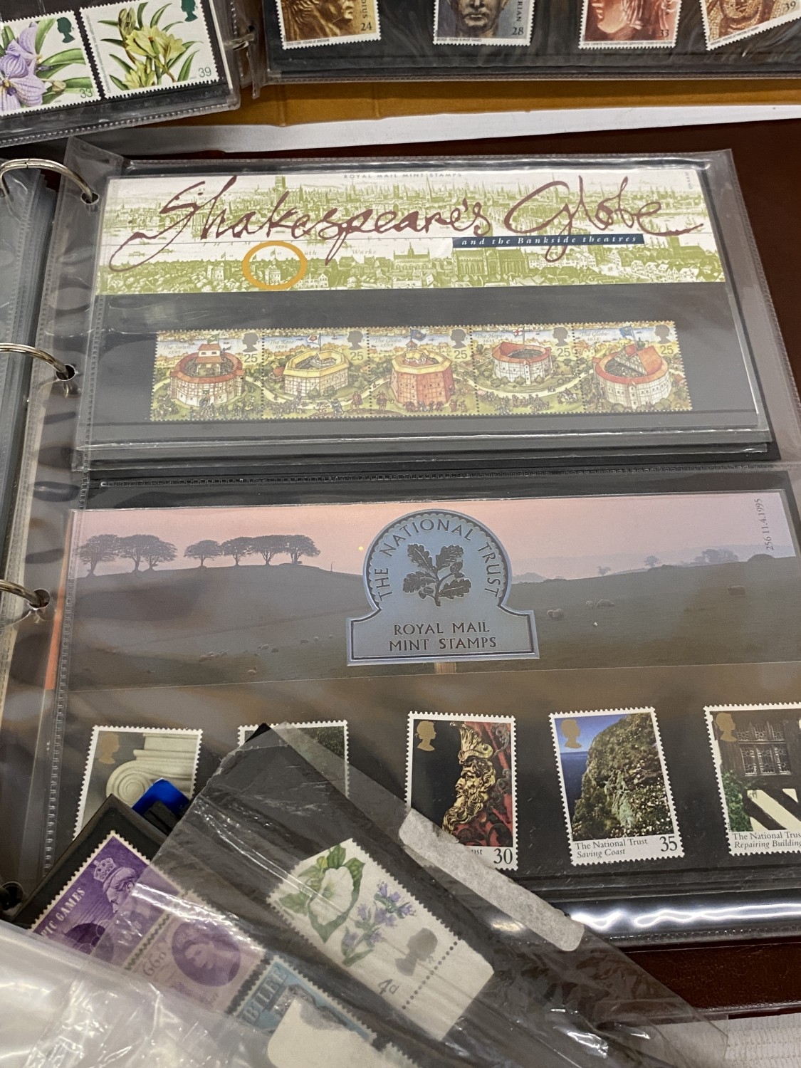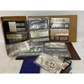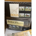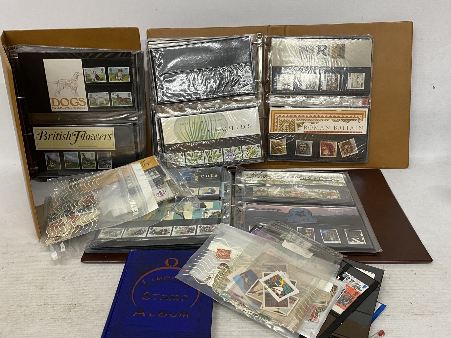 A BOX CONTAINING THREE ROYAL MAIL PRESENTATION PACK ALBUMS PLUS A FILE BOX CONTAINING THE LINCOLN POSTAGE STAMP ALBUM PLUS VARIOUS LOOSE