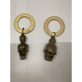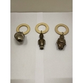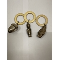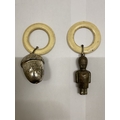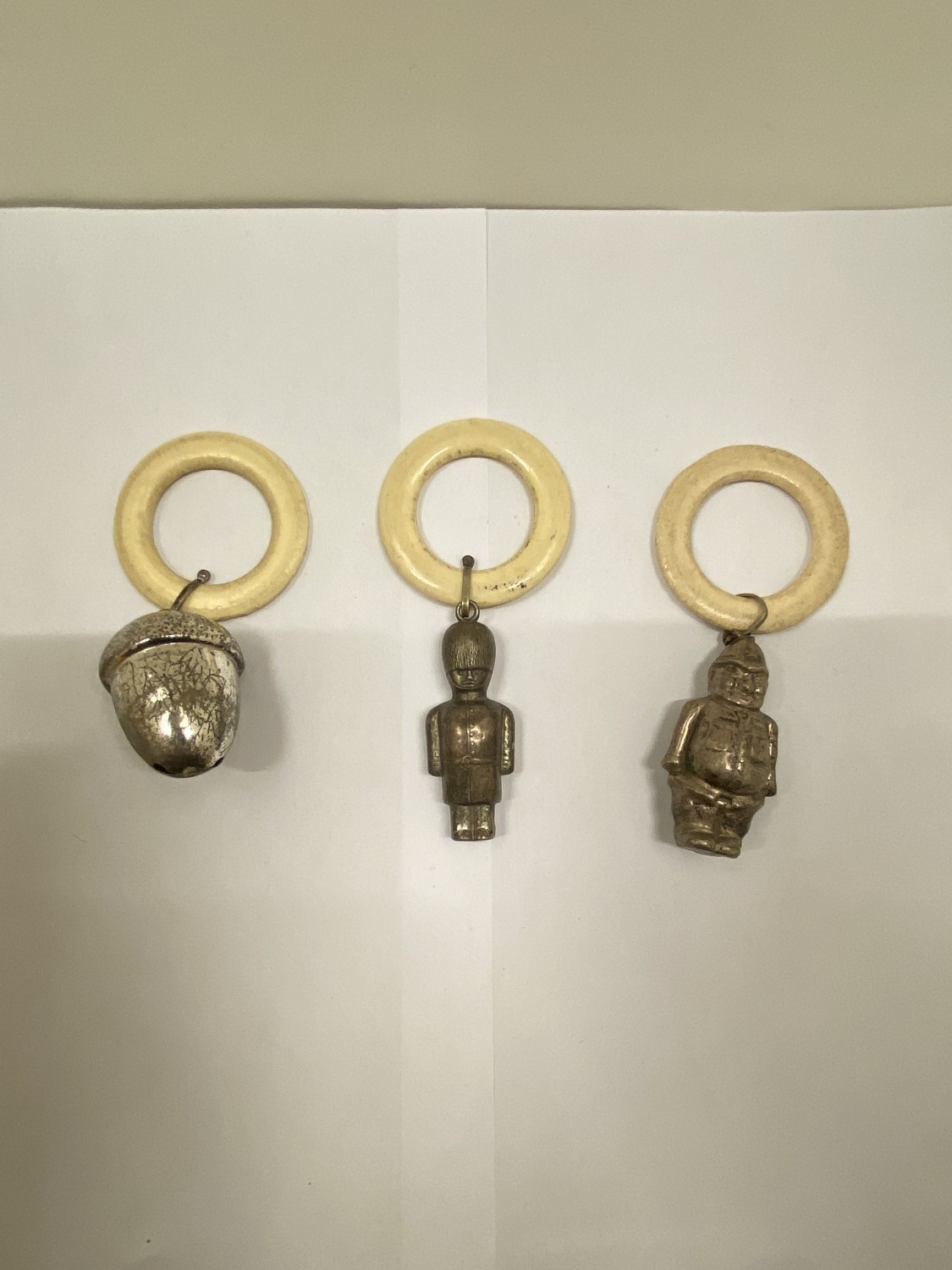 THREE VINTAGE WHITE METAL RATTLES, AN ACORN, POLICEMAN AND SOLDIER
